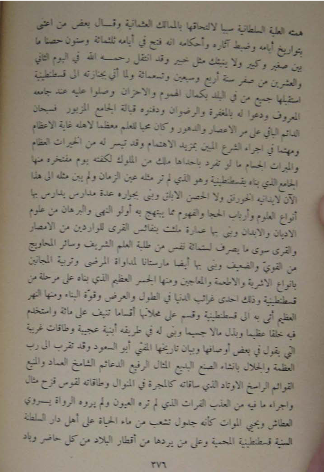 همته الْعلية السُّلْطَانِيَّة سَببا لالتحاقها بالممالك العثمانية وَقَالَ بعض من اعتنى بتواريخ ايامه وَضبط آثاره واحكامه انه فتح فِي أَيَّامه ثلثمائه وَسِتُّونَ حصنا مَا بَين صَغِير وكبير وَلَا ينبئك مثل خَبِير وَقد انْتقل رَحمَه الله فِي الْيَوْم الثَّانِي وَالْعِشْرين من صفر سنة ارْبَعْ وَسبعين وَتِسْعمِائَة وَلما اتي بجنازته الى قسطنطينية اسْتَقْبلهَا جَمِيع من فِي الْبَلَد بِكَمَال الهموم واالأحزان وصلوا عَلَيْهِ عِنْد جَامِعَة الملعروف ودعوا لَهُ بالمغفرة والرضوان ودفنوه قبالة الْجَامِع الْمَزْبُور فسبحان الدَّائِم الْبَاقِي على مر الاعصار والدهور وَكَانَ محبا للْعلم مُعظما لاهله غَايَة الاعظام ومهتما فِي اجراء الشَّرْع الْمُسلمين بمزيد الاهتمام وَقد تيَسّر لَهُ من الْخيرَات الْعِظَام والمبرات الجسام مَا لَو تفرد باحداها ملك من الْمُلُوك لكفته يَوْم مفتخره مِنْهَا الْجَامِع الَّذِي بناه بقسطنطينية وَهُوَ الَّذِي لم تَرَ مثله عين الزَّمَان وَلم يبن مثله الى هَذَا الان لايدانيه الخورنق وَلَا الْحصن الابلق وَبنى بجواره عدَّة مدارس يدارس بهَا انواع الْعُلُوم وأرباب الحجا والفهوم مِمَّا يبتهج بِهِ اولو النهى والبرهان من عُلُوم الاديان والابدان وَبنى بهَا عمَارَة ملئت بنفائس الْقرى للواردين من الامصار والقرى سوى مَا يصرف لستمائة نفس من طلبة الْعلم الشريف وَسَائِر المحاويج من الْقوي والضعيف وَبنى بهَا ايضا مارستانا لمداواة المرضى وتربية المجانين بانواع الاشربة والاطعمة والمعاجين وَمِنْهَا الجسر الْعَظِيم الَّذِي بناه على مرحلة من قسطنطينية وَذَلِكَ احدى غرائب الدُّنْيَا فِي الطول وَالْعرض وَقُوَّة الْبناء وَمِنْهَا النَّهر الْعَظِيم اتى بِهِ الى قسطنطينية وَقسم على محلاتها اقساما تنيف على مائَة واستخدم فِيهِ خلقا عَظِيما وبذل مَالا جسيما وَبنى لَهُ فِي طَرِيقه ابنية عَجِيبَة وطاقات غَرِيبَة الَّتِي يَقُول فِي بعض اوصافها وَبَيَان تاريخها الْمُفْتِي ابو السُّعُود وقدتقرب الى رب العظمة والجلال بانشاء الصنع البديع الْمِثَال الرفيع الدعائم الشامخ الْعِمَاد والمنيع القوائم الراسخ الاوتاد الَّذِي ساقاته كالمجرة فِي المنوال وطاقاته لقوس قزَح مِثَال واجراء مَا فِيهِ من العذب الْفُرَات الَّذِي لم تره الْعُيُون وَلَو يروه الروَاة يروي العطاش وَيحيى الْموَات كَأَنَّهُ جدول تشعب من مَاء الْحَيَاة على اهل دَار السلطنة السّنيَّة قسطنطينية المحمية وعَلى من يردهَا من اقطار الْبِلَاد من كل حَاضر وباد