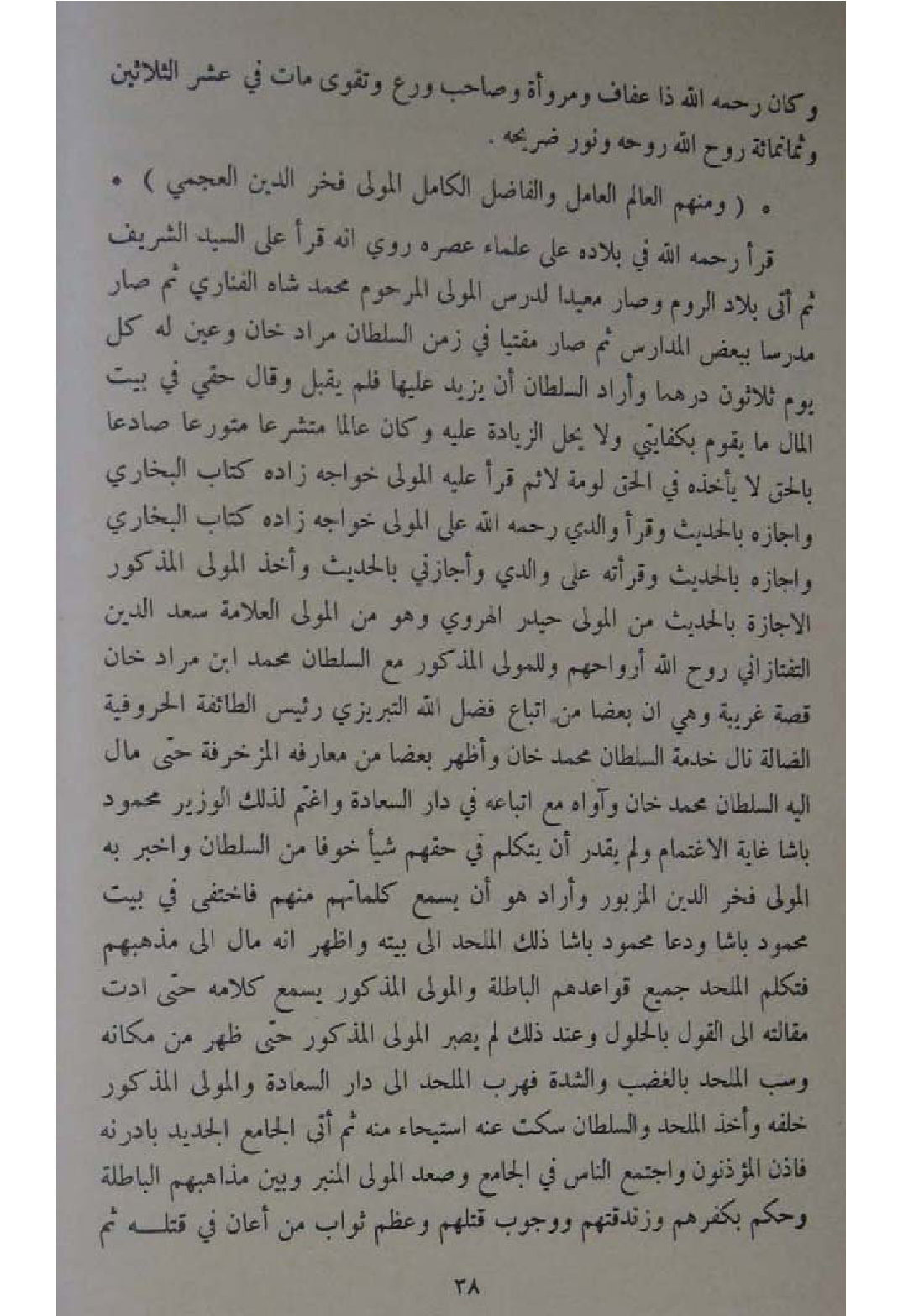قرا رَحمَه الله فِي بِلَاده على عُلَمَاء عصره رُوِيَ انه قَرَأَ على السَّيِّد الشريف ثمَّ اتى بلادالروم وَصَارَ معيدا لدرس الْمولى المرحوم مُحَمَّد شاه الفناري ثمَّ صَار مدرسا بِبَعْض الْمدَارِس ثمَّ صَار مفتيا فِي زمن السُّلْطَان مرادخان وَعين لَهُ كل يَوْم ثَلَاثُونَ درهما وَأَرَادَ السُّلْطَان ان يزِيد عَلَيْهَا فَلم يقبل وَقَالَ حَقي فِي بَيت المَال مَا يقوم بكفايتي وَلَا يحل الزِّيَادَة عَلَيْهِ وَكَانَ عَالما متشرعا متورعا صادعا بِالْحَقِّ لَا يَأْخُذهُ فِي الْحق لومة لائم قَرَأَ عَلَيْهِ الْمولى خواجه زَاده كتاب البُخَارِيّ واجازه بِالْحَدِيثِ وقرا وَالِدي رَحمَه الله على الْمولى خواجه زَاده كتاب البُخَارِيّ واجازه بِالْحَدِيثِ وقرأته على وَالِدي وأجازني بِالْحَدِيثِ وَأخذ الْمولى الْمَذْكُور الاجازة بِالْحَدِيثِ من الْمولى حيدر الْهَرَوِيّ وَهُوَ من الْمولى الْعَلامَة سعدالدين التَّفْتَازَانِيّ روح الله أَرْوَاحهم وللمولى الْمَذْكُور مَعَ السُّلْطَان مُحَمَّد ابْن مُرَاد خَان قصَّة غَرِيبَة وَهِي ان بَعْضًا من اتِّبَاع فضل الله التبريزي رَئِيس الطَّائِفَة الحروفية الضَّالة نَالَ خدمَة السُّلْطَان مُحَمَّد خَان وَأظْهر بَعْضًا من معارفه المزخرفة حَتَّى مَال اليه السُّلْطَان مُحَمَّد خَان وآواه مَعَ اتِّبَاعه فِي دَار السَّعَادَة واعنتم لذَلِك الْوَزير مَحْمُود باشا غَايَة الاغتمام وَلم يقدر ان يتَكَلَّم فِي حَقهم شيأ خوفًا من السُّلْطَان وَأخْبر بِهِ الْمولى فَخر الدّين الْمَزْبُور وَأَرَادَ هُوَ ان يسمع كلماتهم مِنْهُم فاختفى فِي بَيت مَحْمُود باشا ودعا مَحْمُود باشا ذَلِك الملحد الى بَيته واظهر انه مَال الى مَذْهَبهم فَتكلم الملحد جَمِيع قواعدهم الْبَاطِلَة وَالْمولى الْمَذْكُور يسمع كَلَامه حَتَّى ادت مقَالَته الى القَوْل بالحلول وَعند ذَلِك لم يصبر الْمولى الْمَذْكُور حَتَّى ظهر من مَكَانَهُ وَسَب الملحد بِالْغَضَبِ والشدة فهرب الملحد الى دَار السَّعَادَة وَالْمولى الْمَذْكُور خَلفه واخذ الملحد وَالسُّلْطَان سكت عَنهُ استيحاء مِنْهُ ثمَّ اتى الْجَامِع الْجَدِيد بادرنه فاذن المؤذنون وَاجْتمعَ النَّاس فِي الْجَامِع وَصعد الْمولى الْمِنْبَر وَبَين مذاهبهم الْبَاطِلَة وَحكم بكفرهم وزندقتهم وَوُجُوب قَتلهمْ وَعظم ثَوَاب من اعان فِي قَتله ثمَّ