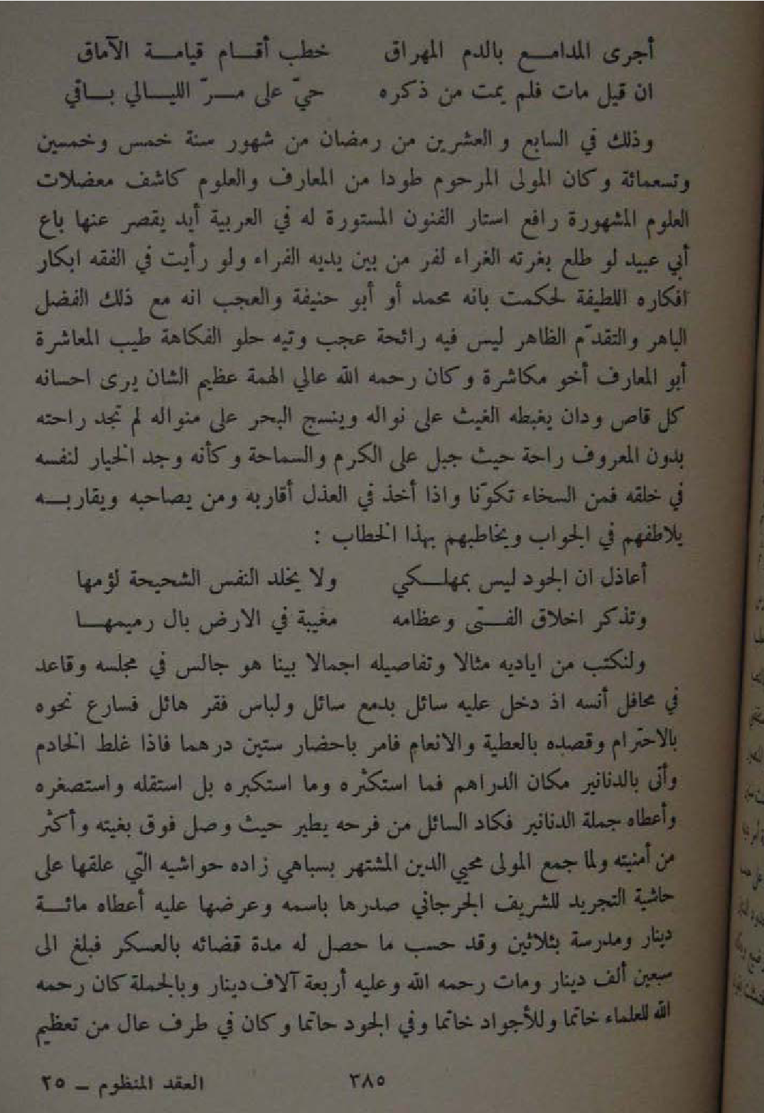 ولنكتب من اياديه مِثَالا وتفاصيله اجمالا بَينا هُوَ جَالس فِي مَجْلِسه وقاعد فِي محافل انسه اذ دخل عَلَيْهِ سَائل بدمع سَائل ولباس فقر هائل فسارع نَحوه بالاحترام وقصده بِالْعَطِيَّةِ والانعام فامر باحضار سِتِّينَ درهما فاذا غلط الْخَادِم واتى بِالدَّنَانِيرِ مَكَان الدَّرَاهِم فَمَا استكثره وَمَا استكبره بل استقله واستصغره واعطاه جملَة الدَّنَانِير فكاد السَّائِل من فرحه يطير حَيْثُ وصل فَوق بغيته وَأكْثر من امنيته وَلما جمع الْمولى محيي الدّين المشتهر بسباهي زَاده حَوَاشِيه الَّتِي علقها على حَاشِيَة التَّجْرِيد للشريف الْجِرْجَانِيّ صدرها باسمه وعرضها عَلَيْهِ اعطاه مائَة دِينَار ومدرسة بِثَلَاثِينَ وَقد حسب مَا حصل لَهُ مُدَّة قَضَائِهِ بالعسكر فَبلغ الى سبعين الف دِينَار وَمَات رَحمَه الله وَعَلِيهِ اربعة آلَاف دِينَار وَبِالْجُمْلَةِ كَانَ رَحمَه الله للْعُلَمَاء خَاتمًا وللأجواد خَاتمًا وَفِي الْجُود حاتما وَكَانَ فِي طرف عَال من تَعْظِيم