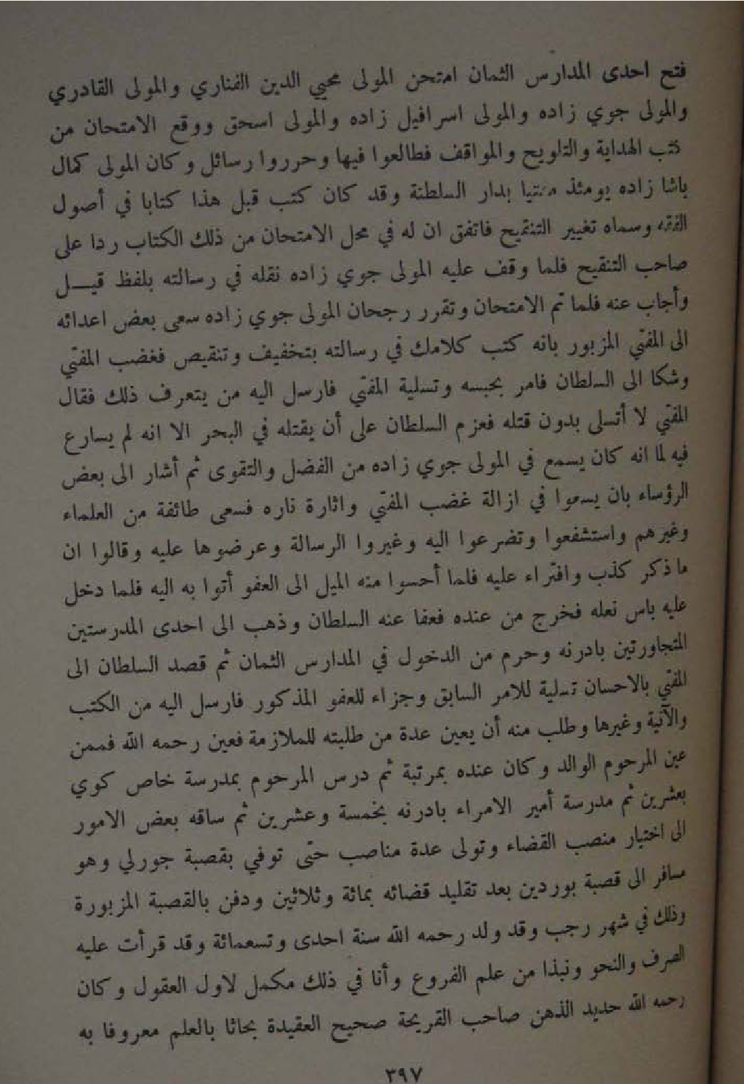 فتح احدى الْمدَارِس الثمان امتحن الْمولى محيي الدّين الفناري وَالْمولى القادري وَالْمولى جوي زَاده وَالْمولى اسرافيل زَاده وَالْمولى اسحق وَوَقع الامتحان من كتب الْهِدَايَة والتلويح والمواقف فطالعوا فِيهَا وحرروا رسائل وَكَانَ الْمولى كَمَال باشا زَاده يؤمئذ مفتيا بدار السلطنة وَقد كَانَ كتب قبل هَذَا كتابا فِي اصول الْفِقْه وَسَماهُ تَغْيِير التَّنْقِيح فاتفق ان لَهُ فِي مَحل الامتحان من ذَلِك الْكتاب ردا على صَاحب التَّنْقِيح فَلَمَّا وقف عَلَيْهِ الْمولى جوي زَاده نَقله فِي رسَالَته بِلَفْظ قيل واجاب عَنهُ فَلَمَّا تمّ الامتحان وتقرر رُجْحَان الْمولى جوي زَاده سعى بعض اعدائه الى الْمُفْتِي الْمَزْبُور بانه كتب كلامك فِي رسَالَته بتَخْفِيف وتنقيص فَغَضب الْمُفْتِي وشكا الى السُّلْطَان فامر بحبسه وتسلية الْمُفْتِي فارسل اليه من يتعرف ذَلِك فَقَالَ الْمُفْتِي لَا اتسلى بِدُونِ قَتله فعزم السُّلْطَان على ان يقْتله فِي الْبَحْر الا انه لم يُسَارع فِيهِ لما انه كَانَ يسمع فِي الْمولى جوي زَاده من الْفضل وَالتَّقوى ثمَّ اشار الى بعض الرؤساء بَان يسعوا فِي ازالة غضب الْمُفْتِي واثاره فسعى طَائِفَة من الْعلمَاء وَغَيرهم استشعفوا وَتَضَرَّعُوا اليه وغيروا الرسَالَة وعرضوها عَلَيْهِ وَقَالُوا ان مَا ذكر كذب وافتراء عَلَيْهِ فملا احسوا مِنْهُ الْميل الى الْعَفو اتوا بِهِ اليه فَلَمَّا دخل عَلَيْهِ باس نَعله فَخرج من عِنْده فَعَفَا عَنهُ السُّلْطَان وَذهب الى احدى المدرستين المتجاورتين بادرنه وَحرم من الدُّخُول فِي الْمدَارِس الثمان ثمَّ قصد السُّلْطَان الى الْمُفْتِي بالاحسان تَسْلِيَة للامر السَّابِق وَجَزَاء للعفو الْمَذْكُور فارسل اليه من الْكتب والانية وَغَيرهَا وَطلب مِنْهُ ان يعين عدَّة من طلبته للملازمة فعين رَحمَه الله فَمِمَّنْ عين المرحوم الْوَالِد وَكَانَ عِنْده بمرتبة ثمَّ درس المرحوم بمدرسة خَاص كوي بِعشْرين ثمَّ مدرسة امير الامراء بادرنه بِخَمْسَة عشْرين ثمَّ سَاقه بعض الامور الى اخْتِيَار منصب الْقَضَاء وَتَوَلَّى عدَّة مناصب حَتَّى توفّي بقصبة جورلي وَهُوَ مُسَافر الى قَصَبَة بوردين بعد تَقْلِيد قَضَائِهِ بِمِائَة وَثَلَاثِينَ وَدفن بالقصبة المزبورة وَذَلِكَ فِي شهر رَجَب وَقد ولد رَحمَه الله سنة احدى وَتِسْعمِائَة وَقد قَرَأت عَلَيْهِ الصّرْف والنحو ونبذا من علم الْفُرُوع وَأَنا فِي ذَلِك مكمل لاول الْعُقُول وَكَانَ رَحمَه الله حَدِيد الذِّهْن صَاحب القريحة صَحِيح العقيدة بحاثا بِالْعلمِ مَعْرُوفا بِهِ