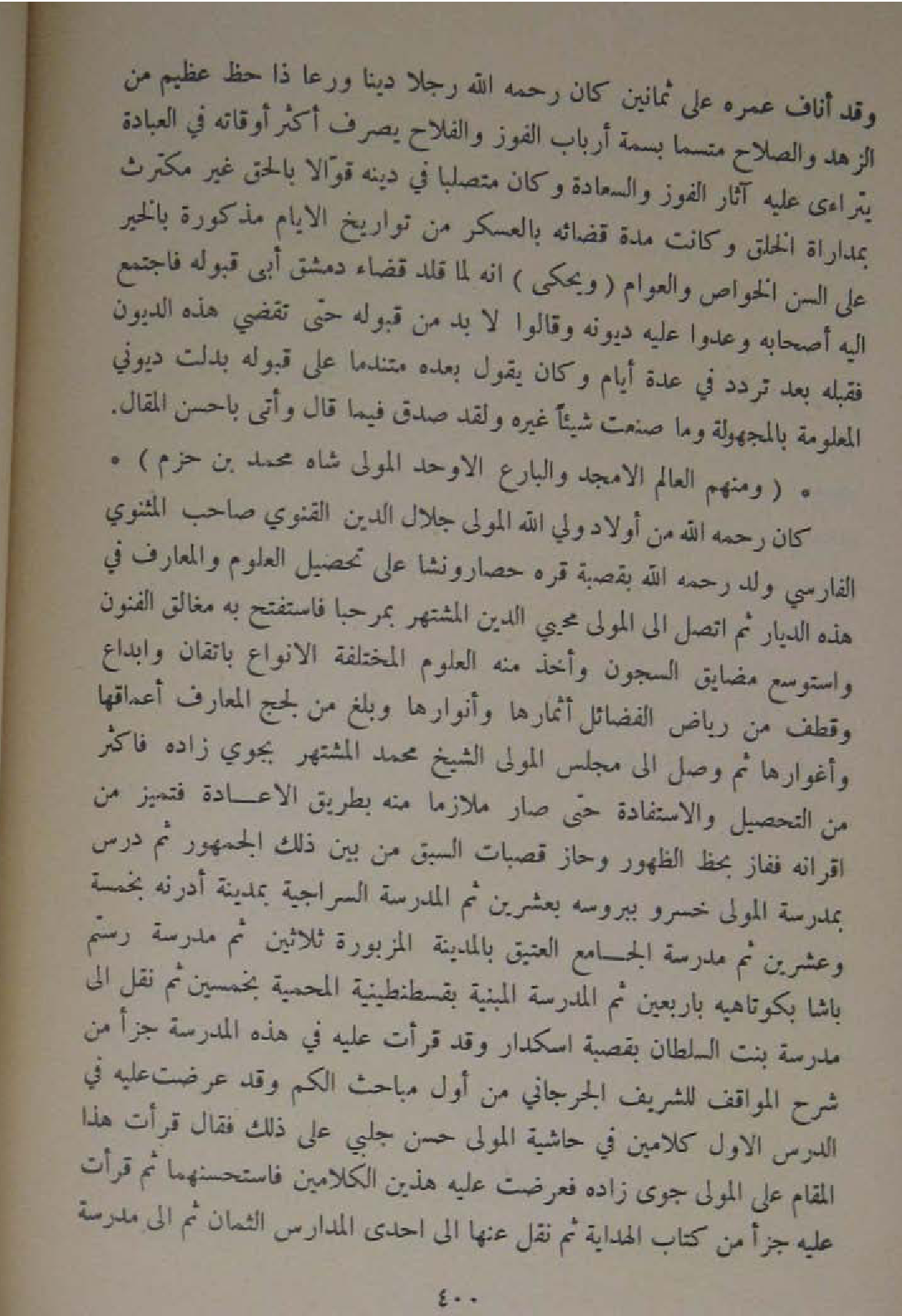 كَانَ رَحمَه الله من اولاد ولي الله الْمولى جلال الدّين القنوي صَاحب المثنوي الْفَارِسِي ولد رَحمَه الله بقصبة قره حِصَار ونشا على تَحْصِيل الْعُلُوم والمعارف فِي هَذِه الديار ثمَّ اتَّصل الى الْمولى محيي الدّين المشتهر بمرحبا فَاسْتَفْتَحَ بِهِ مغالق الْفُنُون وَاسْتَوْسَعَ مضايق السجون وَأخذ مِنْهُ الْعُلُوم الْمُخْتَلفَة الانواع باتقان وابداع وقطف من رياض الْفَضَائِل أثمارها وأنوارها وَبلغ من لجج المعارف اعماقها وأغوارها ثمَّ وصل الى مجْلِس الْمولى الشَّيْخ مُحَمَّد المشتهر بجوي زَاده فاكثر من التَّحْصِيل والاستفادة حَتَّى صَار ملازما مِنْهُ بطرِيق الاعادة فتميز من اقرانه ففاز بحظ الظُّهُور وَحَازَ قصبات السَّبق من بَين ذَلِك الْجُمْهُور ثمَّ درس بمدرسة الْمولى خسرو ببروسه بِعشْرين ثمَّ الْمدرسَة السِّرَاجِيَّة بِمَدِينَة ادرنه بِخَمْسَة وَعشْرين ثمَّ مدرسة الْجَامِع الْعَتِيق بِالْمَدِينَةِ المزبورة ثَلَاثِينَ ثمَّ مدرسة رستم باشا بكوتاهيه باربعين ثمَّ الْمدرسَة المبنية بقسطنطينية المحمية بِخَمْسِينَ ثمَّ نقل الى مدرسة بنت السُّلْطَان بقصبة اسكدار وَقد قرات عَلَيْهِ فِي هَذِه الْمدرسَة جزأ من شرح المواقف للشريف الْجِرْجَانِيّ من اول مبَاحث الْكمّ وَقد عرضت عَلَيْهِ فِي الدَّرْس الاول كلامين فِي حَاشِيَة الْمولى حسن جلبي على ذَلِك فَقَالَ قَرَأت هَذَا الْمقَام على الْمولى جوى زَاده فعرضت عَلَيْهِ هذَيْن الْكَلَامَيْنِ فاستحسنهما ثمَّ قَرَأت عَلَيْهِ جزأ من كتاب الْهِدَايَة ثمَّ نقل عَنْهَا الى احدى الْمدَارِس الثمان ثمَّ الى مدرسة
