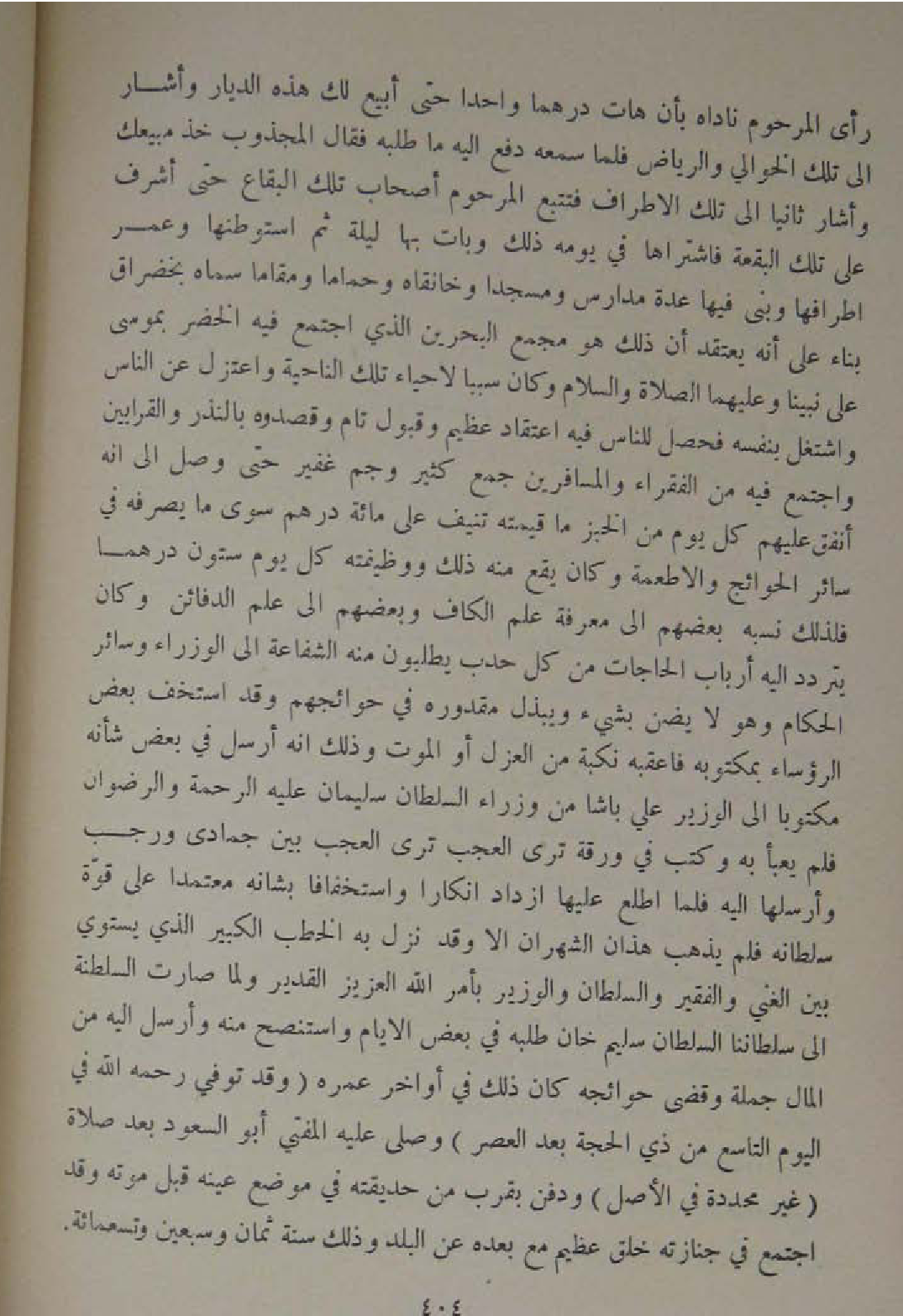رأى المرحوم ناداه بِأَن هَات درهما وَاحِدًا حَتَّى ابيع لَك هَذِه الديار واشار الى تِلْكَ الخوالي والرياض فَلَمَّا سَمعه دفع اليه مَا طلبه فَقَالَ المجذوب خُذ مبيعك واشار ثَانِيًا الى تِلْكَ الاطراف فتتبع المرحوم اصحاب تِلْكَ الْبِقَاع حَتَّى اشرف على تِلْكَ الْبقْعَة فاشتراها فِي يَوْمه ذَلِك وَبَات بهَا لَيْلَة ثمَّ استوطنها وَعمر اطرافها وَبنى فِيهَا عدَّة مدارس ومسجدا وخانقاه وحماما ومقاما سَمَّاهُ بخضراق بِنَاء على انه يعْتَقد ان ذَلِك هُوَ مجمع الْبَحْرين الَّذِي اجْتمع فِيهِ الْخضر بمُوسَى على نَبينَا وَعَلَيْهِمَا الصَّلَاة وَالسَّلَام وَكَانَ سَببا لاحياء تِلْكَ النَّاحِيَة وَاعْتَزل عَن النَّاس واشتغل بِنَفسِهِ فَحصل للنَّاس فِيهِ اعْتِقَاد عَظِيم وَقبُول تَامّ وقصدوه بِالنذرِ والقرابين وَاجْتمعَ فِيهِ من الْفُقَرَاء والمسافرين جمع كثير وجم غفير حَتَّى وصل الى انه انفق عَلَيْهِم كل يَوْم من الْخبز مَا قِيمَته تنيف على مائَة دِرْهَم سوى مَا يصرفهُ فِي سَائِر الْحَوَائِج والاطعمة وَكَانَ يَقع مِنْهُ ذَلِك ووظيفته كل يَوْم سِتُّونَ درهما فَلذَلِك نسبه بَعضهم الى معرفَة علم الْكَاف وَبَعْضهمْ الى علم الدفائن وَكَانَ يتَرَدَّد اليه ارباب الْحَاجَات من كل حدب يطْلبُونَ مِنْهُ الشَّفَاعَة الى الوزراء وَسَائِر الْحُكَّام وَهُوَ لَا يضن بِشَيْء ويبذل مقدوره فِي حوائجهم وَقد استخف بعض الرؤساء بمكتوبه فاعقبه نكبة من الْعَزْل اَوْ الْمَوْت وَذَلِكَ انه ارسل فِي بعض شَأْنه مَكْتُوبًا الى الْوَزير عَليّ باشا من وزارء السُّلْطَان سُلَيْمَان عَلَيْهِ الرَّحْمَة والرضوان فَلم يعبأ بِهِ وَكتب فِي ورقة ترى الْعجب ترى الْعجب بَين جُمَادَى وَرَجَب وأرسلها اليه فَلَمَّا اطلع عَلَيْهَا ازْدَادَ انكارا واستخفافا بشانه مُعْتَمدًا على قُوَّة سُلْطَانه فَلم يذهب هَذَانِ الشهران الا وَقد نزل بِهِ الْخطب الْكَبِير الَّذِي يَسْتَوِي بَين الْغَنِيّ وَالْفَقِير وَالسُّلْطَان والوزير بِأَمْر الله الْعَزِيز الْقَدِير وَلما صَارَت السلطنة الى سلطاننا السُّلْطَان سليم خَان طلبه فِي بعض الايام واستنصح مِنْهُ وارسل اليه من المَال جملَة وَقضى حَوَائِجه كَانَ ذَلِك فِي اواخر عمره وقدتوفي رَحمَه الله فِي الْيَوْم التَّاسِع من ذِي الْحجَّة بعدالعصر وَصلى عَلَيْهِ الْمُفْتِي ابو السُّعُود بعد صَلَاة غير محددة فِي الاصل وَدفن بِقرب من حديقته فِي مَوضِع عينه قبل مَوته وَقد اجْتمع فِي جنَازَته خلق عَظِيم مَعَ بعده عَن الْبَلَد وَذَلِكَ سنة ثَمَان وَسبعين وَتِسْعمِائَة