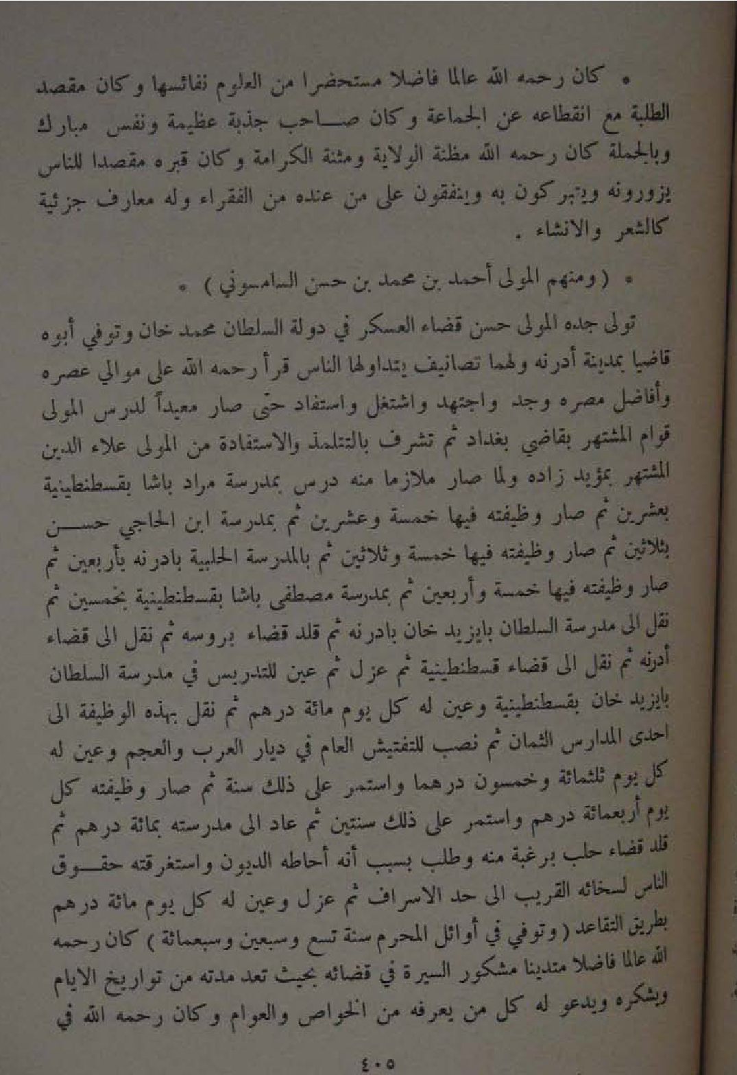 تولى جده الْمولى حسن قَضَاء الْعَسْكَر فِي دولة السُّلْطَان مُحَمَّد خَان وَتُوفِّي ابوه قَاضِيا بِمَدِينَة ادرنه وَلَهُمَا تصانيف يتداولها النَّاس قَرَأَ رَحمَه الله على موَالِي عصره وافاضل مصره وجد واجتهد واشتغل واستفاد حَتَّى صَار معيدا لدرس الْمولى قوام المشتهر بقاضي بَغْدَاد ثمَّ تشرف بالتتلمذ والاستفادة من الْمولى عَلَاء الدّين المشتهر بمؤيد زَاده وَلما صَار ملازما مِنْهُ درس بمدرسة مُرَاد باشا بقسطنطينية بِعشْرين ثمَّ صَار وظيفته فِيهَا خَمْسَة وَعشْرين ثمَّ بمدرسة ابْن الحاجي حسن بِثَلَاثِينَ ثمَّ صَار وظفيته فِيهَا خَمْسَة وَثَلَاثِينَ ثمَّ بِالْمَدْرَسَةِ الحلبية بادرنه بِأَرْبَعِينَ ثمَّ صَار وظيفته فِيهَا خَمْسَة واربعين ثمَّ بمدرسة مصطفى باشا بقسطنطينية بِخَمْسِينَ ثمَّ نقل الى مدرسة السُّلْطَان بايزيدخان بادرنه ثمَّ قلد قَضَاء بروسه ثمَّ نقل الى قَضَاء ادرنه ثمَّ نقل الى قَضَاء قسطنطينية ثمَّ عزل ثمَّ عين للتدريس فِي مدرسة السُّلْطَان بايزيدخان بقسطنطينية وَعين لَهُ كل يَوْم مائَة دِرْهَم ثمَّ نقل بِهَذِهِ الْوَظِيفَة الى احدى الْمدَارِس الثمان ثمَّ نصب للتفتيش الْعَام فِي ديار الْعَرَب والعجم وَعين لَهُ كل يَوْم ثلثمِائة وَخَمْسُونَ درهما وَاسْتمرّ على ذَلِك سنة ثمَّ صَار وظيفته كل يَوْم اربعمائة دِرْهَم وَاسْتمرّ على ذَلِك سنتَيْن ثمَّ عَاد الى مدرسته بِمِائَة دِرْهَم ثمَّ قلد قَضَاء حلب برغبة مِنْهُ وَطلب بِسَبَب انه احاطه الدُّيُون واستغرقته حُقُوق النَّاس لسخائه الْقَرِيب الى حد الاسراف ثمَّ عزل وَعين لَهُ كل يَوْم مائَة دِرْهَم بطرِيق التقاعد وَتُوفِّي فِي اوائل الْمحرم سنة تسع وَسبعين وَسَبْعمائة كَانَ رَحمَه الله عَالما فَاضلا متدينا مشكور السِّيرَة فِي قَضَائِهِ بِحَيْثُ تعد مدَّته من تواريخ الايام ويشكره وَيَدْعُو لَهُ كل من يعرفهُ من الْخَواص والعوام وَكَانَ رَحمَه الله فِي