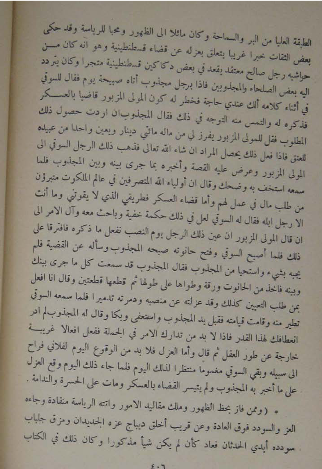 الطَّبَقَة الْعليا من الْبر والسماحة وَكَانَ مائلا الى الظُّهُور ومحبا للرياسة وَقد حكى بعض الثِّقَات خَبرا غَرِيبا يتَعَلَّق بعزله عَن قَضَاء قسطنطينية وَهُوَ انه كَانَ من حَوَاشِيه رجل صَالح مُعْتَقد يقْعد فِي بعض دكاكين قسطنطينية متجرا وَكَانَ يتَرَدَّد اليه بعض الصلحاء والمجذوبين فاذا بِرَجُل مجذوب اتاه صَبِيحَة يَوْم فَقَالَ للسوقي فِي اثناء كَلَامه الك عِنْدِي حَاجَة فخطر لَهُ كَون الْمولى الْمَزْبُور قَاضِيا بالعسكر فَذكره لَهُ وَالْتمس مِنْهُ التَّوَجُّه فِي ذَلِك فَقَالَ المجذوب ان اردت حُصُول ذَلِك الْمَطْلُوب فَقل للْمولى الْمَزْبُور يفرز لي من مَاله مِائَتي دِينَار ويعين وَاحِدًا من عبيده لِلْعِتْقِ فاذا فعل ذَلِك يحصل المُرَاد ان شَاءَ الله تَعَالَى فَذهب ذَلِك الرجل السوقي الى الْمولى الْمَزْبُور وَعرض عَلَيْهِ الْقِصَّة واخبره بِمَا جرى بَينه وَبَين المجذوب فَلَمَّا سَمعه استخف بِهِ وَضحك وَقَالَ ان اولياء الله المتصرفين فِي عَالم المكلوت متبرؤن من طلب مَال فِي عمل لَهُم واما قَضَاء الْعَسْكَر فطريقي الَّذِي لَا يقوتني وَمَا انت الا رجل ابله فَقَالَ لَهُ السوقي لَعَلَّ فِي ذَلِك حِكْمَة خُفْيَة وباحث مَعَه وَآل الامر الى ان قَالَ الْمولى الْمَزْبُور ان عين ذَلِك الرجل يَوْم النصب نَفْعل مَا ذكره فَافْتَرقَا على ذَلِك فَلَمَّا اصبح السوقي وَفتح حانوته صبحه المجذوب وَسَأَلَهُ عَن الْقَضِيَّة فَلم يجبهُ بِشَيْء واستحيا من المجذوب فَقَالَ المجذوب قد سَمِعت كل مَا جرى بَين بَيْنك وَبَينه فاخذ من الْحَانُوت ورقة وطواها على طولهَا ثمَّ قطعهَا قطعتين وَقَالَ انا افْعَل بِمن طلب التَّعْيِين كَذَلِك وَقد عزلته عَن منصبه ودمرته تدميرا فَلَمَّا سَمعه السوقي تطير مِنْهُ وَقَامَت قِيَامَته فَقبل يَد المجذوب واستعفى وبكا وَقَالَ لَهُ المجذوب لم ادر انعطافك لهَذَا الْقدر فاذا لَا بُد من تدارك الامر فِي الْجُمْلَة فَفعل افعالا غَرِيبَة خَارِجَة عَن طور الْعقل ثمَّ قَالَ واما الْعَزْل فَلَا بُد من الْوُقُوع الْيَوْم الْفُلَانِيّ فراح الى سَبيله وَبَقِي السوقي مغموما منتظرا لذَلِك الْيَوْم فَلَمَّا جَاءَ ذَلِك الْيَوْم وَقع الْعَزْل على مَا أخبر بِهِ المجذوب وَلم يَتَيَسَّر الْقَضَاء بالعسكر وَمَات على الْحَسْرَة والندامة