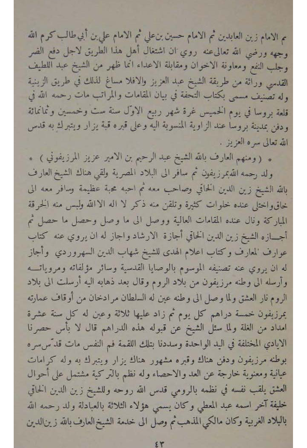 ثمَّ الامام زين العابدين ثمَّ الامام حُسَيْن بن عَليّ ثمَّ الامام عَليّ بن ابي طَالب كرم الله وَجهه وَرَضي الله تَعَالَى عَنهُ رُوِيَ ان اشْتِغَال اهل هَذَا الطَّرِيق لاجل دفع الضّر وجلب النَّفْع ومعاونة الاخوان ومقابلة الاعداء انما ظهر من الشَّيْخ عبد اللطيف الْقُدسِي وراثة من طَريقَة الشَّيْخ عبد العزيز والافلا مساغ لذَلِك فِي طَرِيق الزينية وَله تصنيف مُسَمّى بِكِتَاب التُّحْفَة فِي بَيَان المقامات والمراتب مَاتَ رَحمَه الله فِي قلعة بروسا فِي يَوْم الْخَمِيس غرَّة شهر ربيع الاول سنة سِتّ وَخمسين وَثَمَانمِائَة وَدفن بِمَدِينَة بروسا عِنْد الزاوية المنسوبة اليه وعَلى قَبره قبَّة يزار ويتبرك بِهِ قدس الله تَعَالَى سره الْعَزِيز