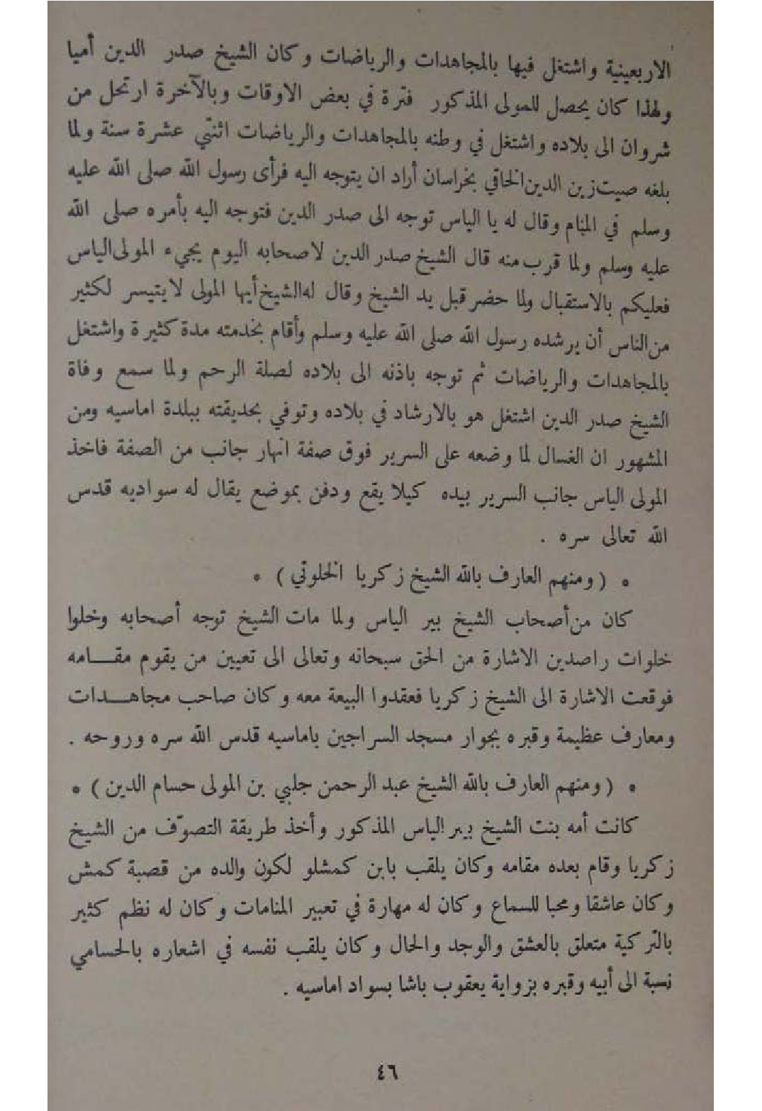 الاربعينية واشتغل فِيهَا بالمجاهدات والرياضات وَكَانَ الشَّيْخ صدر الدّين اميا وَلِهَذَا كَانَ يحصل للْمولى الْمَذْكُور فَتْرَة فِي بعض الاوقات وبالاخرة ارتحل من شرْوَان الى بِلَاده واشتغل فِي وَطنه بالمجاهدات والرياضات اثْنَتَيْ عشرَة سنة وَلما بلغه صيت زين الدّين الخاقي بخراسان أَرَادَ ان يتَوَجَّه اليه فَرَأى رَسُول الله صلى الله عَلَيْهِ وَسلم فِي الْمَنَام وَقَالَ لَهُ يَا الياس توجه الى صَدرا لدين فَتوجه اليه بأَمْره صلى الله عَلَيْهِ وَسلم وَلما قرب مِنْهُ قَالَ الشَّيْخ صدر الدّين لاصحابه الْيَوْم يَجِيء الْمولى الياس فَعَلَيْكُم بالاستقبال وَلما حضر قبل يدالشيخ وَقَالَ لَهُ الشَّيْخ أَيهَا الْمولى لَا يَتَيَسَّر لكثير من النَّاس ان يرشده رَسُول الله صلى الله عَلَيْهِ وَسلم وَأقَام بخدمته مُدَّة كَثِيرَة واشتغل بالمجاهدات والرياضات ثمَّ توجه باذنه الى بِلَاده لصلة الرَّحِم وَلما سمع وَفَاة الشَّيْخ صدر الدّين اشْتغل هُوَ بالارشاد فِي بِلَاده وَتُوفِّي بحديقته ببلدة اماسيه وَمن الْمَشْهُور ان الغسال لما وَضعه على السرير فَوق صفة انهار جَانب من الصّفة فَأخذ الْمولى الياس جَانب السرير بِيَدِهِ كَيْلا يَقع وَدفن بِموضع يُقَال لَهُ سواديه قدس الله تَعَالَى سره