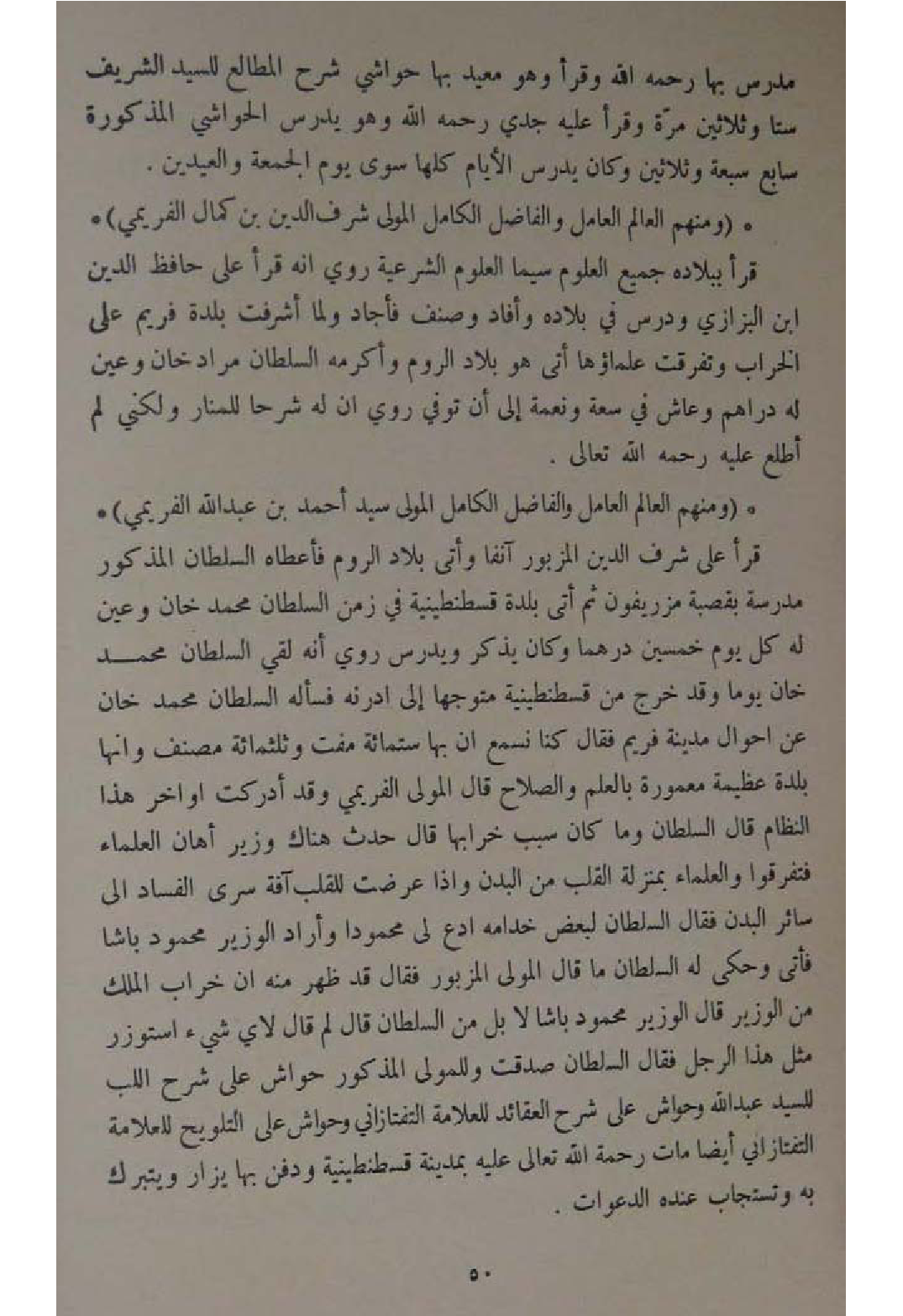 وَمِنْهُم الْعَالم الْعَامِل والفاضل الْكَامِل الْمولى سيد احْمَد بن عبد الله الفريمي قرا على شرف الدّين الْمَزْبُور آنِفا وأتى بلادالروم فَأعْطَاهُ السُّلْطَان الْمَذْكُور مدرسة بقصبة مزريفون ثمَّ أَتَى بَلْدَة قسطنطينية فِي زمن السُّلْطَان مُحَمَّد خَان عين لَهُ كل يَوْم خمسين درهما وَكَانَ يذكر ويدرس رُوِيَ انه لَقِي السُّلْطَان مُحَمَّد خَان يَوْمًا وَقد خرج من قسطنطينية مُتَوَجها الى ادرنه فَسَأَلَهُ السُّلْطَان مُحَمَّد خَان عَن أَحْوَال مَدِينَة فريم فَقَالَ كُنَّا نسْمع ان بهَا سِتّمائَة مفت وثلثمائة مُصَنف وَأَنَّهَا بَلْدَة عَظِيمَة معمورة بِالْعلمِ وَالصَّلَاح قَالَ الْمولى الفريمي وَقد أدْركْت اواخر هَذَا النظام قَالَ السُّلْطَان وَمَا كَانَ سَبَب خرابها قَالَ حدث هُنَاكَ وَزِير أهان الْعلمَاء فَتَفَرَّقُوا وَالْعُلَمَاء بِمَنْزِلَة الْقلب من الْبدن وَإِذا عرضت للقلب آفَة سرى الْفساد الى سَائِر الْبدن فَقَالَ السُّلْطَان لبَعض خُدَّامه ادْع لي مَحْمُودًا واراد الْوَزير مَحْمُود باشا فَأتى وَحكى لَهُ السُّلْطَان مَا قَالَ الْمولى الْمَزْبُور فَقَالَ قد ظهر مِنْهُ ان خراب الْملك من الْوَزير قَالَ الْوَزير مَحْمُود باشا لَا بل من السُّلْطَان قَالَ لم قَالَ لاي شَيْء استوزر مثل هَذَا الرجل فَقَالَ السُّلْطَان صدقت وللمولى الْمَذْكُور حواش على شرح اللب للسَّيِّد عبد الله وحواش على شرح العقائد للعلامة التَّفْتَازَانِيّ وحواش على التَّلْوِيح للعلامة التَّفْتَازَانِيّ ايضا مَاتَ رَحْمَة الله تَعَالَى عَلَيْهِ بِمَدِينَة قسطنطينية وَدفن بهَا يزار ويتبرك بِهِ وتستجاب عِنْده الدَّعْوَات