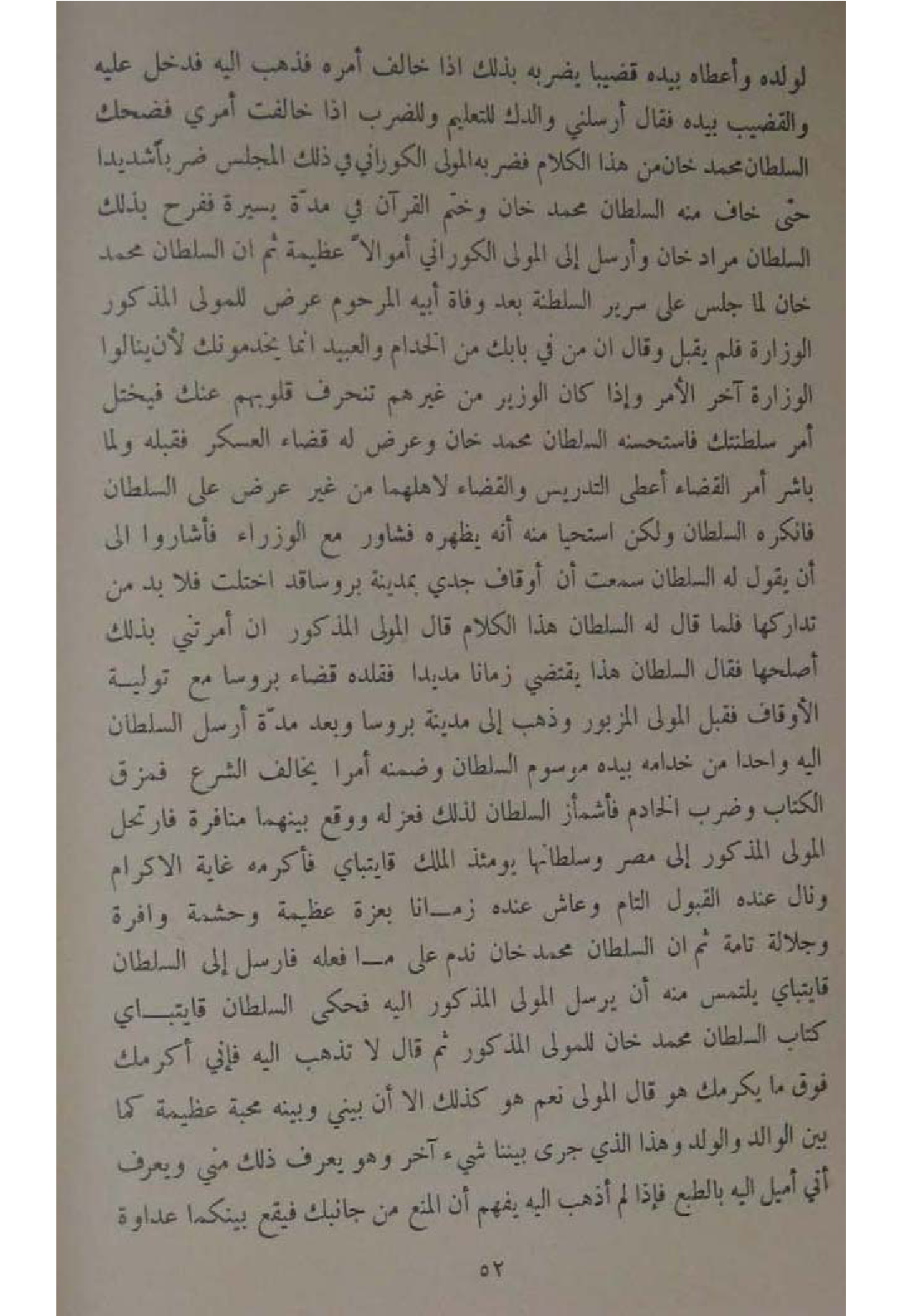 لوَلَده وَأَعْطَاهُ بِيَدِهِ قَضِيبًا يضْربهُ بذلك إِذا خَالف أمره فَذهب اليه فَدخل عَلَيْهِ والقضيب بِيَدِهِ فَقَالَ ارسلني والدك للتعليم وللضرب إِذا خَالَفت امري فَضَحِك السُّلْطَان مُحَمَّد خَان من هَذَا الْكَلَام فَضَربهُ الْمولى الكوراني فِي ذَلِك الْمجْلس ضربا شَدِيدا حَتَّى خَافَ مِنْهُ السُّلْطَان مُحَمَّد خَان وَختم الْقُرْآن فِي مُدَّة يسيرَة ففرح بذلك السُّلْطَان مرادخان وَأرْسل الى الْمولى الكوراني اموالا عَظِيمَة ثمَّ ان السُّلْطَان مُحَمَّد خَان لما جلس على سَرِير السلطنة بعد وَفَاة ابيه المرحوم عرض للْمولى الْمَذْكُور الوزارة فَلم يقبل وَقَالَ ان من فِي بابك من الخدام وَالْعَبِيد إِنَّمَا يخدمونك لَان ينالوا الوزارة آخر الامر وَإِذا كَانَ الْوَزير من غَيرهم تنحرف قُلُوبهم عَنْك فيختل امْر سلطنتك فَاسْتَحْسَنَهُ السُّلْطَان مُحَمَّد خَان وَعرض لَهُ قَضَاء الْعَسْكَر فَقبله وَلما بَاشر امْر الْقَضَاء اعطى التدريس وَالْقَضَاء لاهلهما من غير عرض على السُّلْطَان فانكره السُّلْطَان وَلَكِن استحيا مِنْهُ انه يظهره فَشَاور مَعَ الوزراء فأشاروا الى ان يَقُول لَهُ السُّلْطَان سَمِعت ان اوقاف جدي بِمَدِينَة بروسا قد اختلت فَلَا بُد من تداركها فَلَمَّا قَالَ لَهُ السُّلْطَان هَذَا الْكَلَام قَالَ الْمولى الْمَذْكُور ان امرتني بذلك اصلحها فَقَالَ السُّلْطَان هَذَا يَقْتَضِي زَمَانا مديدا فقلده قَضَاء بروسا مَعَ تَوْلِيَة الاوقاف فَقبل الْمولى الْمَزْبُور وَذهب الى مَدِينَة بروسا وَبعد مُدَّة ارسل السُّلْطَان اليه وَاحِدًا ن خُدَّامه بِيَدِهِ مَوْسُوم السُّلْطَان وَضَمنَهُ امرا يُخَالف الشَّرْع فمزق الْكتاب وَضرب الْخَادِم فأشمأز السُّلْطَان لذَلِك فَعَزله وَوَقع بَينهمَا منافرة فارتحل الْمولى الْمَذْكُور الى مصر وسلطانها يَوْمئِذٍ الْملك قايتباي فَأكْرمه غَايَة الاكرام ونال عِنْده الْقبُول التَّام وعاش عِنْده زَمَانا بعزة عَظِيمَة وحشمة وافرة وجلالة تَامَّة ثمَّ ان السُّلْطَان مُحَمَّد خَان نَدم على مَا فعله فارسل الى السُّلْطَان قايتباي كتاب السُّلْطَان مُحَمَّد خَان للْمولى الْمَذْكُور ثمَّ قَالَ لَا تذْهب اليه فَإِنِّي اكرمك فَوق مَا يكرمك هُوَ قَالَ الْمولى نعم هُوَ كَذَلِك الا ان بيني وَبَينه محبَّة عَظِيمَة كَمَا بَين الْوَالِد وَالْولد وَهَذَا الَّذِي جرى بَيْننَا شَيْء آخر وَهُوَ يعرف ذَلِك مني وَيعرف اني اميل اليه بالطبع فَإِذا لم أذهب اليه يفهم ان الْمَنْع من جَانِبك فَيَقَع بَيْنكُمَا عَدَاوَة