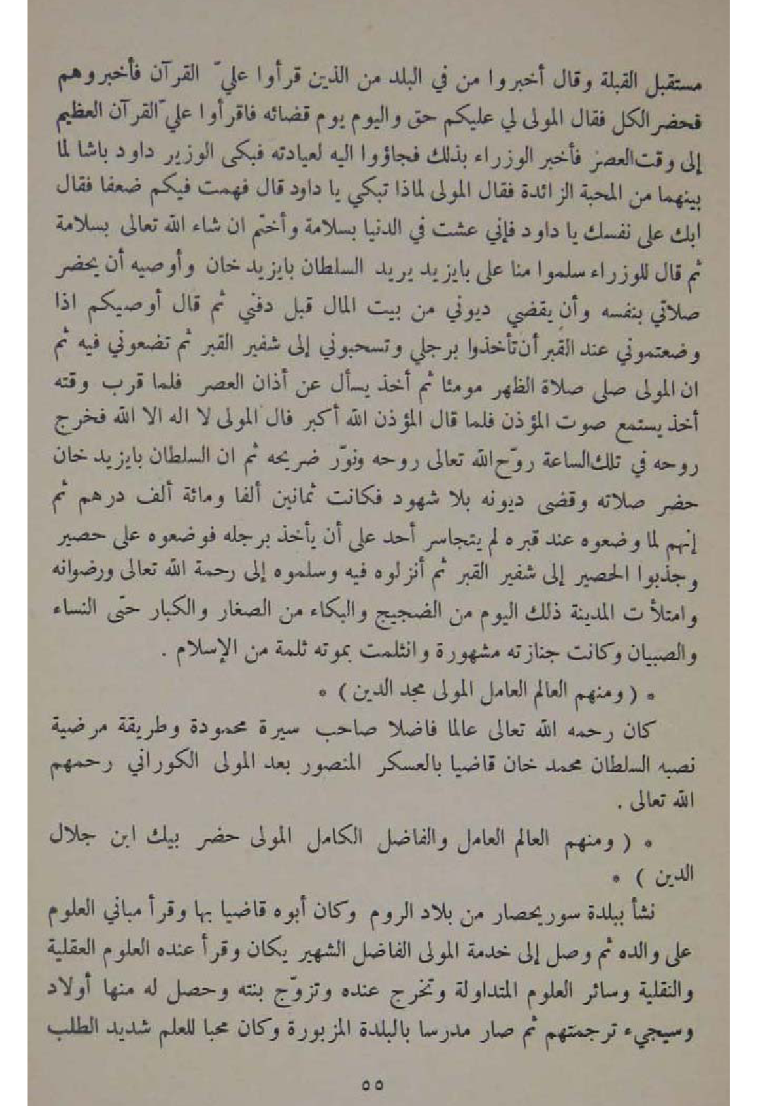 مُسْتَقْبل الْقبْلَة وَقَالَ اخبروا من فِي الْبَلَد من الَّذين قرأوا عَليّ الْقُرْآن فَأَخْبرُوهُمْ فَحَضَرَ الْكل فَقَالَ الْمولى لي عَلَيْكُم حق وَالْيَوْم يَوْم قَضَائِهِ فاقراوا عَليّ الْقُرْآن الْعَظِيم الى وَقت الْعَصْر فاخبر الوزراء بذلك فجاؤوا اليه لعيادته فَبكى الْوَزير دَاوُد باشا لما بَينهمَا من الْمحبَّة الزَّائِدَة فَقَالَ الْمولى لماذا تبْكي يَا دَاوُد قَالَ فهمت فِيكُم ضعفا فَقَالَ ابك على نَفسك يَا دَاوُد فَإِنِّي عِشْت فِي الدُّنْيَا بسلامة وَاخْتِمْ ان شَاءَ الله تَعَالَى بسلامة ثمَّ قَالَ للوزراء سلمُوا منا على بايزيد يُرِيد السُّلْطَان بايزيدخان اوصيه ان يحضر صَلَاتي بِنَفسِهِ وان يقْضِي ديوني من بَيت المَال قبل دفني ثمَّ قَالَ اوصيكم إِذا وضعتموني عندالقبر ان تَأْخُذُوا برجلي وتسحبوني الى شَفير الْقَبْر ثمَّ تضعوني فِيهِ ثمَّ ان الْمولى صلى صَلَاة الظّهْر مومئا ثمَّ اخذ يسْأَل عَن أَذَان الْعَصْر فَلَمَّا قرب وقته اخذ يستمع صَوت الْمُؤَذّن فَلَمَّا قَالَ الْمُؤَذّن الله أكبر قَالَ الْمولى لَا اله الا الله فَخرج روحه فِي تِلْكَ السَّاعَة روح الله تَعَالَى روحه وَنور ضريحه ثمَّ ان السُّلْطَان بايزيد خَان حضر صلَاته وَقضى دُيُونه بِلَا شُهُود فَكَانَت ثَمَانِينَ الْفَا وَمِائَة الف دِرْهَم ثمَّ انهم لما وضعوه عِنْد قَبره لم يتجاسر اُحْدُ على ان يَأْخُذ بِرجلِهِ فوضعوه على حَصِير وجذبوا الْحَصِير الى شَفير الْقَبْر ثمَّ انزلوه فِيهِ وسلموه الى رَحْمَة الله تَعَالَى ورضوانه وامتلأت الْمَدِينَة ذَلِك الْيَوْم من الضجيج والبكاء من الصغار والكبار حَتَّى النِّسَاء وَالصبيان وَكَانَت جنَازَته مَشْهُورَة وانثلمت بِمَوْتِهِ ثلمة من الاسلام