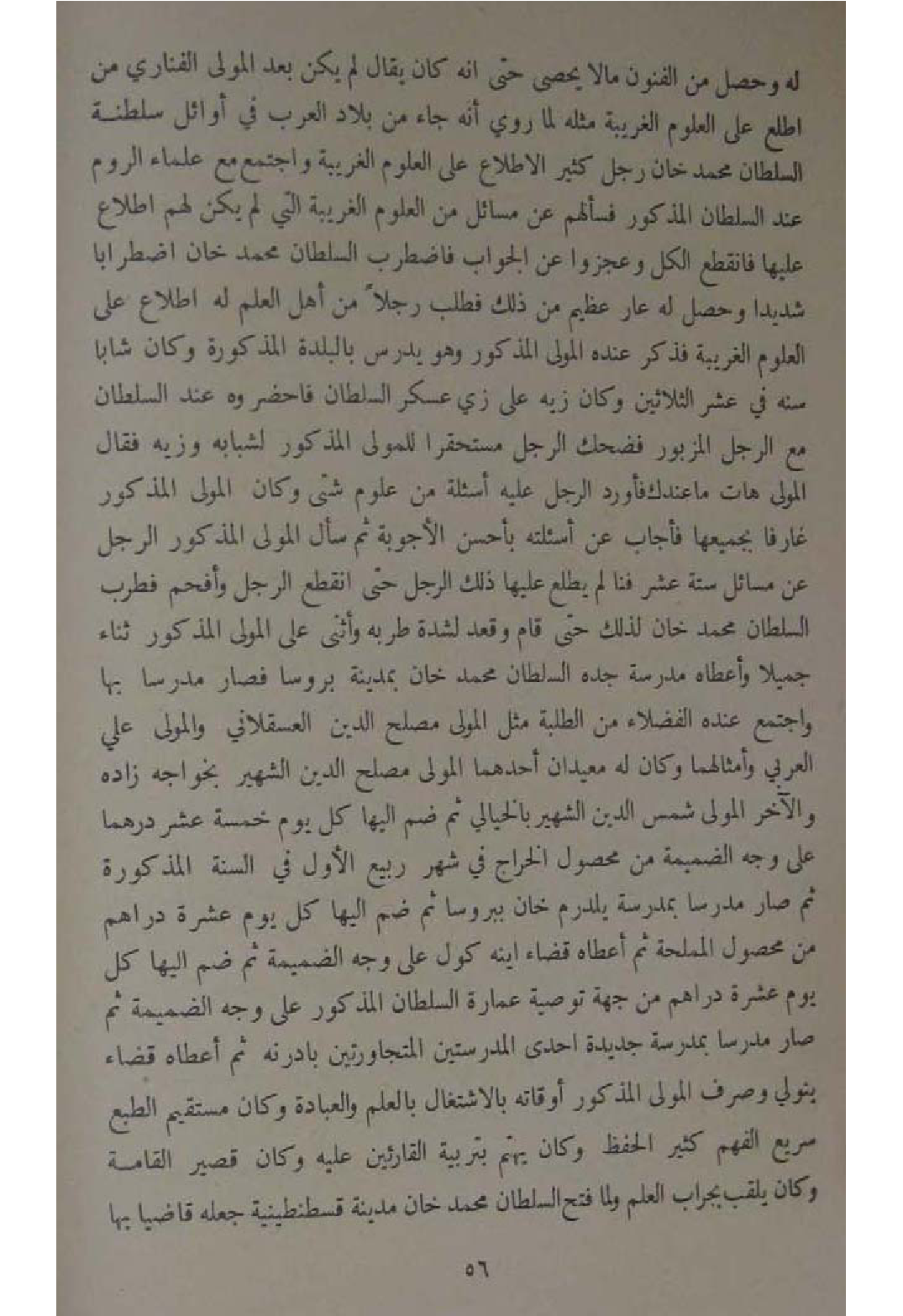 لَهُ وَحصل من الْفُنُون مَالا يُحْصى حَتَّى انه كَانَ يُقَال لم يكن بعدالمولى الفناري من اطلع على الْعُلُوم الغريبة مثله لما رُوِيَ انه جَاءَ من بلادالعرب فِي اوائل سلطنة السُّلْطَان محمدخان رجل كثير الِاطِّلَاع على الْعُلُوم الغريبة وَاجْتمعَ مَعَ عُلَمَاء الرّوم عندالسلطان الْمَذْكُور فَسَأَلَهُمْ عَن مسَائِل من الْعُلُوم الغريبة الَّتِي لم يكن لَهُم اطلَاع عَلَيْهَا فَانْقَطع الْكل وعجزوا عَن الْجَواب فاضطرب السُّلْطَان محمدخان اضطرابا شَدِيدا وَحصل لَهُ عَار عَظِيم من ذَلِك فَطلب رجلا من اهل الْعلم لَهُ اطلَاع على الْعُلُوم الغريبة فَذكر عِنْده الْمولى الْمَذْكُور وَهُوَ يدرس بالبلدة الْمَذْكُورَة وَكَانَ شَابًّا سنه فِي عشر الثَّلَاثِينَ وَكَانَ زيه على زِيّ عَسْكَر السُّلْطَان فاحضروه عندالسلطان مَعَ الرجل الْمَزْبُور فَضَحِك الرجل مستحقرا للْمولى الْمَذْكُور لشبابه وزيه فَقَالَ الْمولى هَات مَا عنْدك فأورد الرجل عَلَيْهِ اسئلة من عُلُوم شَتَّى وَكَانَ الْمولى الْمَذْكُور عَارِفًا بجميعها فَأجَاب عَن اسئلته بِأَحْسَن الاجوبة ثمَّ سَأَلَ الْمولى الْمَذْكُور الرجل عَن مسَائِل سِتَّة عشر فَنًّا لم يطلع عَلَيْهَا ذَلِك الرجل حَتَّى انْقَطع الرجل وافحم فطرب السُّلْطَان مُحَمَّد خَان لذَلِك حَتَّى قَامَ وَقعد لشدَّة طربه واثنى على الْمولى الْمَذْكُور ثَنَاء جميلا واعطاه مدرسة جده السُّلْطَان مُحَمَّد خَان بِمَدِينَة بروسا فَصَارَ مدرسا بهَا وَاجْتمعَ عِنْده الْفُضَلَاء من الطّلبَة مثل الْمولى مصلح الدّين الْعَسْقَلَانِي وَالْمولى عَليّ الْعَرَبِيّ وامثالهما وَكَانَ لَهُ معيدان احدهما الْمولى مصلح الدّين الشهير بخواجه زَاده والاخر الْمولى شمس الدّين الشهير بالخيالي ثمَّ ضم اليها كل يَوْم خَمْسَة عشر درهما على وَجه الضميمة من محصول الْخراج فِي شهر ربيع الاول فِي السّنة الْمَذْكُورَة ثمَّ صَار مدرسا بمدرسة يلدرم خَان ببروسا ثمَّ ضم اليها كل يَوْم عشرَة دَرَاهِم من محصول المملحة ثمَّ اعطاه قَضَاء اينه كول على وَجه الضميمة ثمَّ ضم اليها كل يَوْم عشرَة دَرَاهِم من جِهَة توصية عمَارَة السُّلْطَان الْمَذْكُور على وَجه الضميمة ثمَّ صَار مدرسا بمدرسة جَدِيدَة احدى المدرستين المتجاورتين بادرنه ثمَّ اعطاه قَضَاء ينولي وَصرف الْمولى الْمَذْكُور أوقاته بالاشتغال بِالْعلمِ وَالْعِبَادَة وَكَانَ مُسْتَقِيم الطَّبْع سريع الْفَهم كثير الْحِفْظ وَكَانَ يهتم بتربية القارئين عَلَيْهِ وَكَانَ قصير الْقَامَة وَكَانَ يلقب بجراب الْعلم وَلما فتح السُّلْطَان مُحَمَّد خَان مَدِينَة قسطنطينية جعله قَاضِيا بهَا