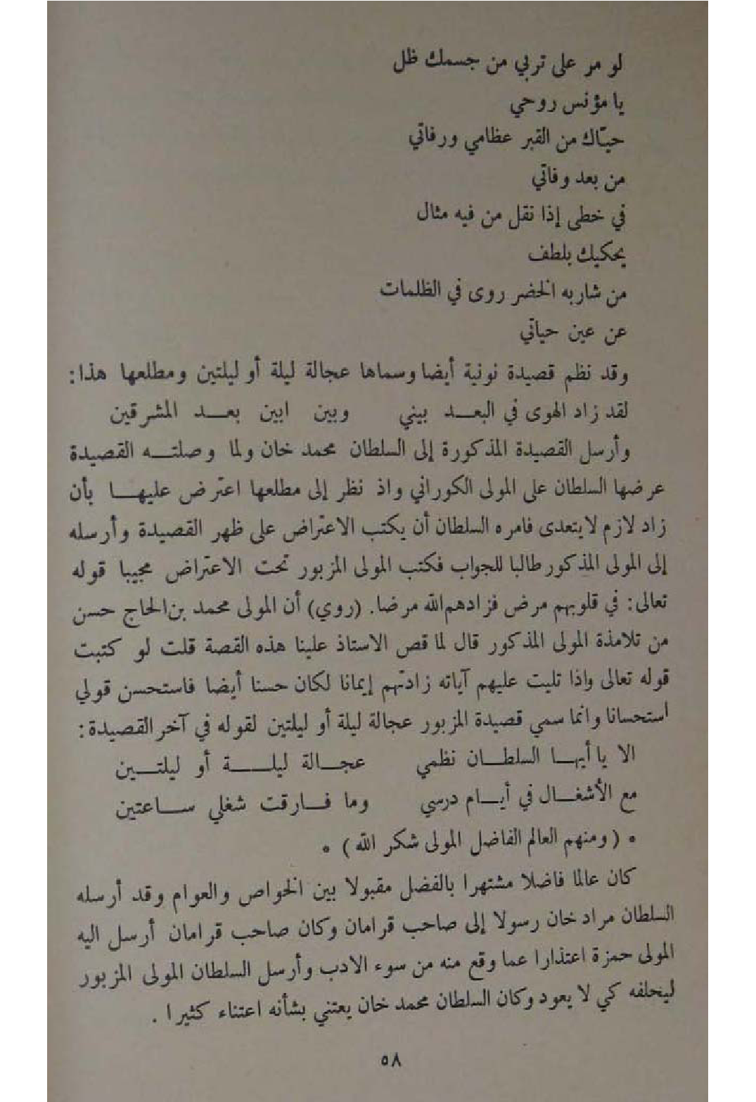 وَأرْسل القصيدة الْمَذْكُورَة الى السُّلْطَان مُحَمَّد خَان وَلما وصلته القصيدة عرضهَا السُّلْطَان على الْمولى الكوراني واذ نظر الى مطْلعهَا اعْترض عَلَيْهَا بِأَن زَاد لَازم لَا يتَعَدَّى فامره السُّلْطَان ان يكْتب الِاعْتِرَاض على ظهر القصيدة وأرسله الى الْمولى الْمَذْكُور طَالبا للجواب فَكتب الْمولى الْمَزْبُور تَحت الِاعْتِرَاض مجيبا قَوْله تَعَالَى فِي قُلُوبهم مرض فَزَادَهُم الله مَرضا رُوِيَ ان الْمولى مُحَمَّد بن الْحَاج حسن من تلامذة الْمولى الْمَذْكُور قَالَ لما قصّ الاستاذ علينا هَذِه الْقِصَّة قلت لَو كتبت قَوْله تَعَالَى وَإِذا تليت عَلَيْهِم آيَاته زادتهم إِيمَانًا لَكَانَ حسنا ايضا فَاسْتحْسن قولي اسْتِحْسَانًا وَإِنَّمَا سمي قصيدة الْمَزْبُور عجالة لَيْلَة اَوْ لَيْلَتَيْنِ لقَوْله فِي آخر القصيدة ... الا يَا أَيهَا السُّلْطَان نظمي ... عجالة لَيْلَة اَوْ لَيْلَتَيْنِ