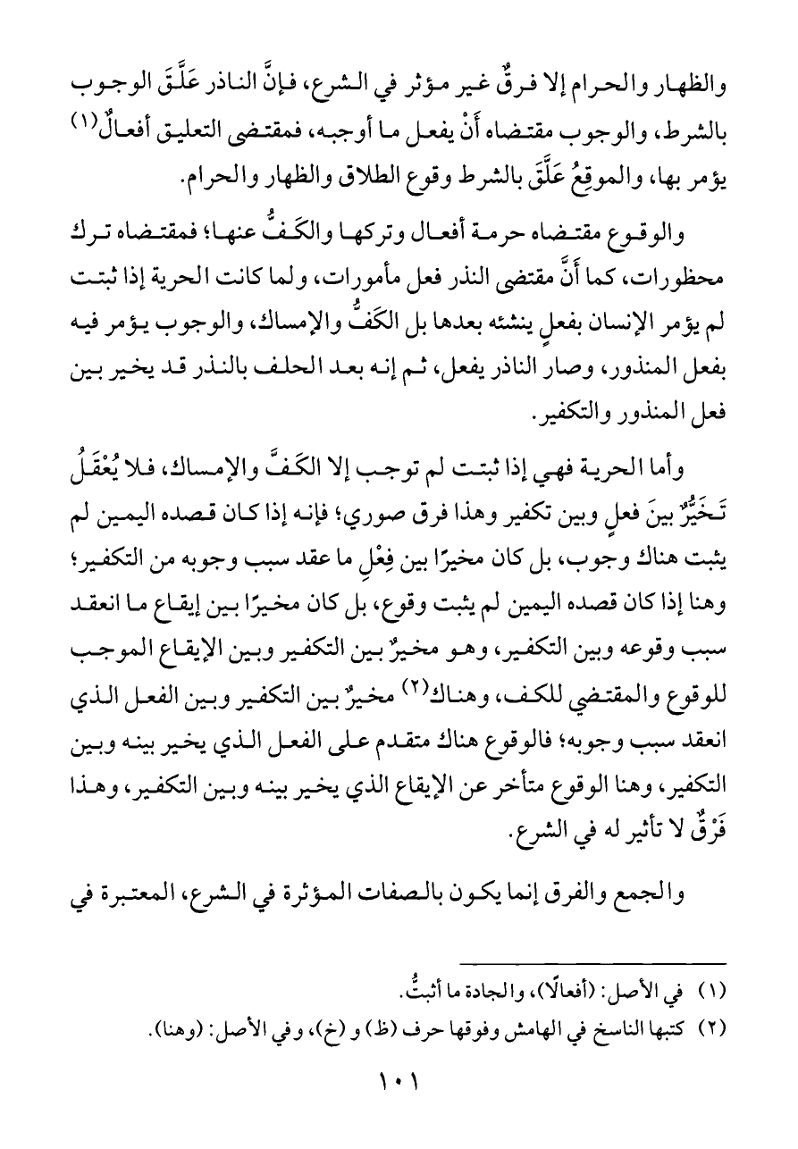 والوقوع مقتضاه حرمة أفعال وتركها والكَفُّ عنها؛ فمقتضاه ترك محظورات، كما أَنَّ مقتضى النذر فعل مأمورات، ولما كانت الحرية إذا ثبتت لم يؤمر الإنسان بفعلٍ ينشئه بعدها بل الكَفُّ والإمساك، والوجوب يؤمر فيه بفعل المنذور، وصار الناذر يفعل، ثم إنه بعد الحلف بالنذر قد يخير بين فعل المنذور والتكفير.