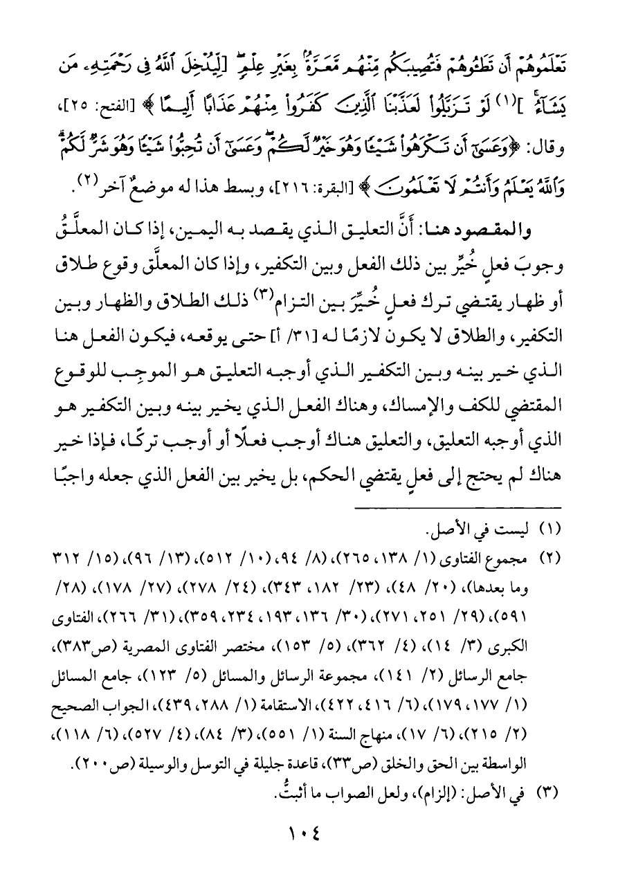 والمقصود هنا: أَنَّ التعليق الذي يقصد به اليمين، إذا كان المعلَّقُ وجوبَ فعلٍ خُيِّر بين ذلك الفعل وبين التكفير، وإذا كان المعلَّق وقوع طلاق أو ظهار يقتضي ترك فعلٍ خُيِّرَ بين التزام (¬٣) ذلك الطلاق والظهار وبين التكفير، والطلاق لا يكون لازمًا له [٣١/ أ] حتى يوقعه، فيكون الفعل هنا الذي خير بينه وبين التكفير الذي أوجبه التعليق هو الموجِب للوقوع المقتضي للكف والإمساك، وهناك الفعل الذي يخير بينه وبين التكفير هو الذي أوجبه التعليق، والتعليق هناك أوجب فعلًا أو أوجب تركًا، فإذا خير هناك لم يحتج إلى فعلٍ يقتضي الحكم، بل يخير بين الفعل الذي جعله واجبًا