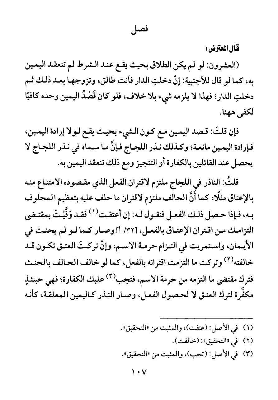 قلتُ: الناذر في اللجاج ملتزم لاقتران الفعل الذي مقصوده الامتناع منه بالإعتاق مثلًا، كما أَنَّ الحالف ملتزم لاقتران ما حلف عليه بتعظيم المحلوف به، فإذا حصل ذلك الفعل فنقول له: إن أعتقت (¬١) فقد وَفَّيْتَ بمقتضى التزامك من اقتران الإعتاق بالفعل، [٣٢/ أ] وصار كما لو لم يحنث في الأيمان، واستمريت في التزام حرمة الاسم، وإنْ تركتَ العتق تكون قد خالفته (¬٢) وتركت ما التزمت اقترانه بالفعل، كما لو خالف الحالف بالحنث فترك مقتضى ما التزمه من حرمة الاسم، فتجب (¬٣) عليك الكفارة؛ فهي حينئذٍ مكفَّرة لترك العتق لا لحصول الفعل، وصار النذر كاليمين المعلقة، كأنه