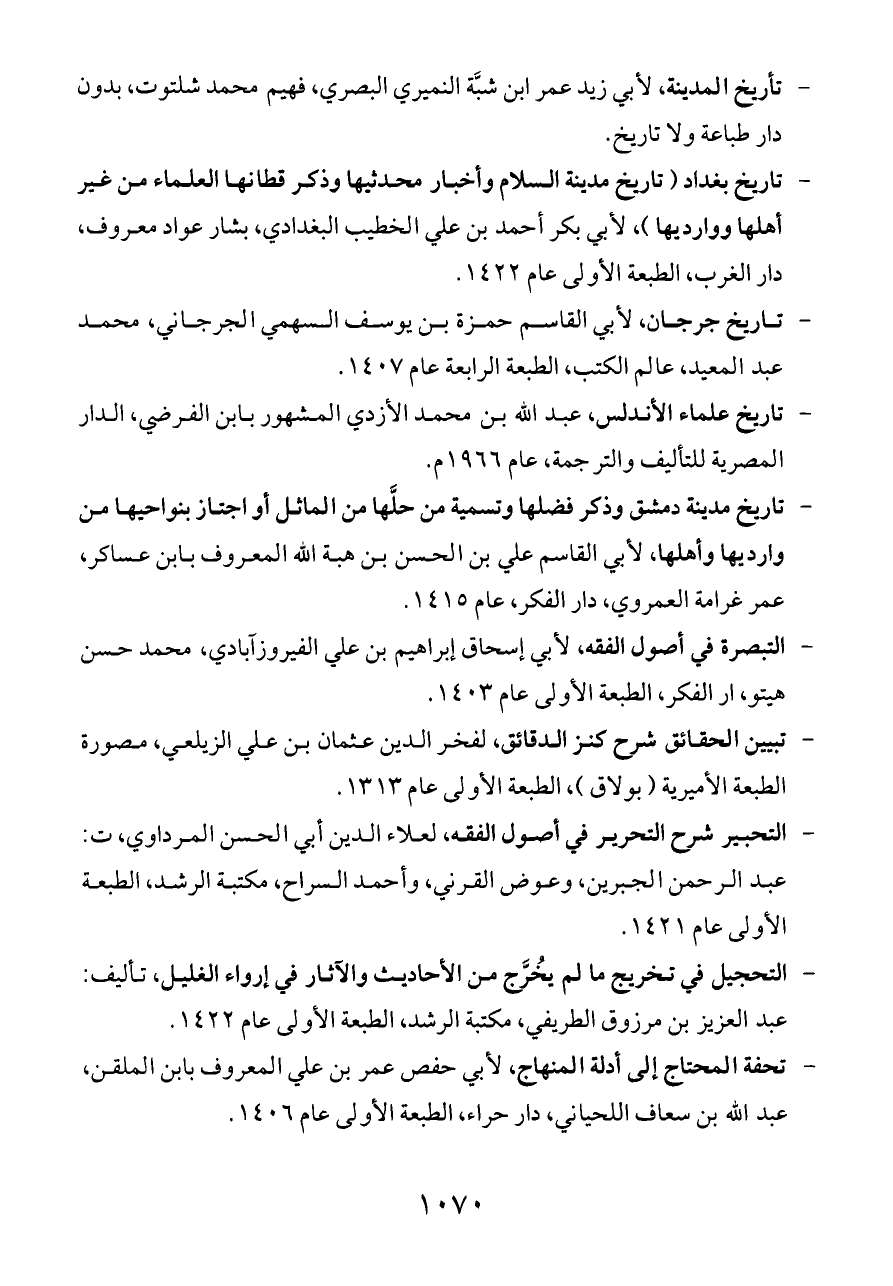 - تحفة المحتاج إلى أدلة المنهاج، لأبي حفص عمر بن علي المعروف بابن الملقن، عبد الله بن سعاف اللحياني، دار حراء، الطبعة الأولى عام ١٤٠٦.