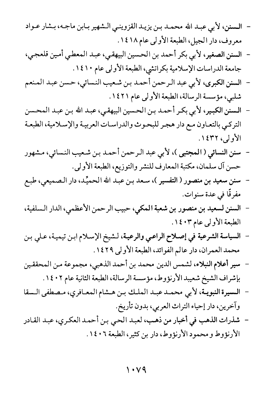 - السنن الكبير، لأبي بكر أحمد بن الحسين البيهقي، عبد الله بن عبد المحسن التركي بالتعاون مع دار هجر للبحوث والدراسات العربية والإسلامية، الطبعة الأولى، ١٤٣٢.