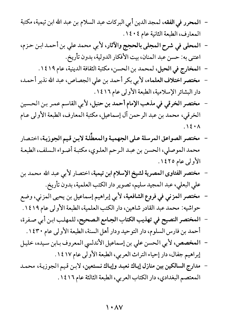 - مختصر الخرقي في مذهب الإمام أحمد بن حنبل، لأبي القاسم عمر بن الحسين الخرقي، محمد بن عبد الرحمن آل إسماعيل، مكتبة المعارف، الطبعة الأولى عام ١٤٠٨.