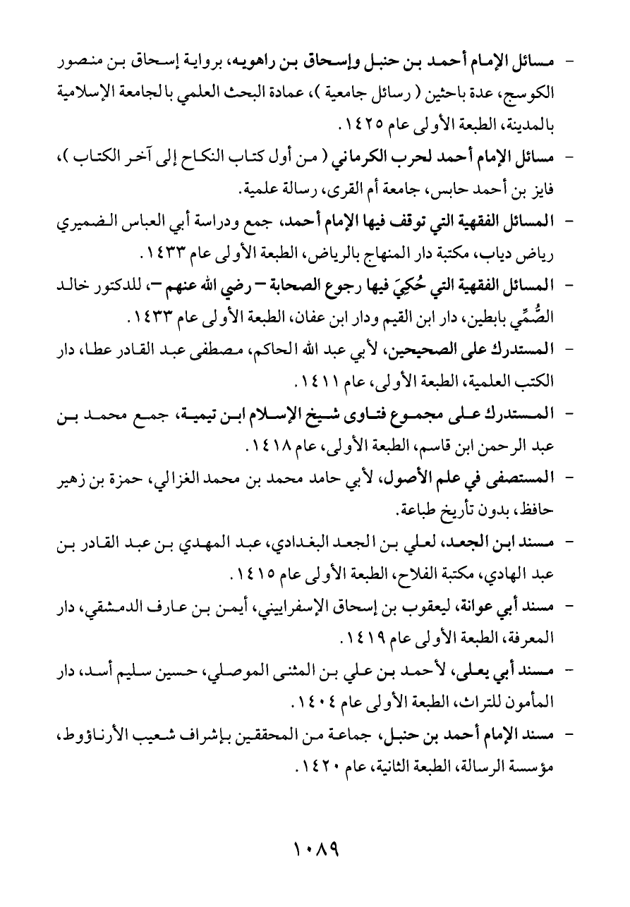 - مسائل الإمام أحمد بن حنبل وإسحاق بن راهويه، برواية إسحاق بن منصور الكوسج، عدة باحثين (رسائل جامعية)، عمادة البحث العلمي بالجامعة الإسلامية بالمدينة، الطبعة الأولى عام ١٤٢٥.