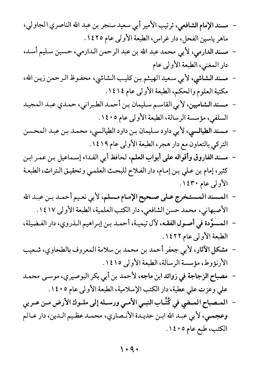 - مسند الشاشي، لأبي سعيد الهيثم بن كليب الشاشي، محفوظ الرحمن زين الله، مكتبة العلوم والحكم، الطبعة الأولى عام ١٤١٤.