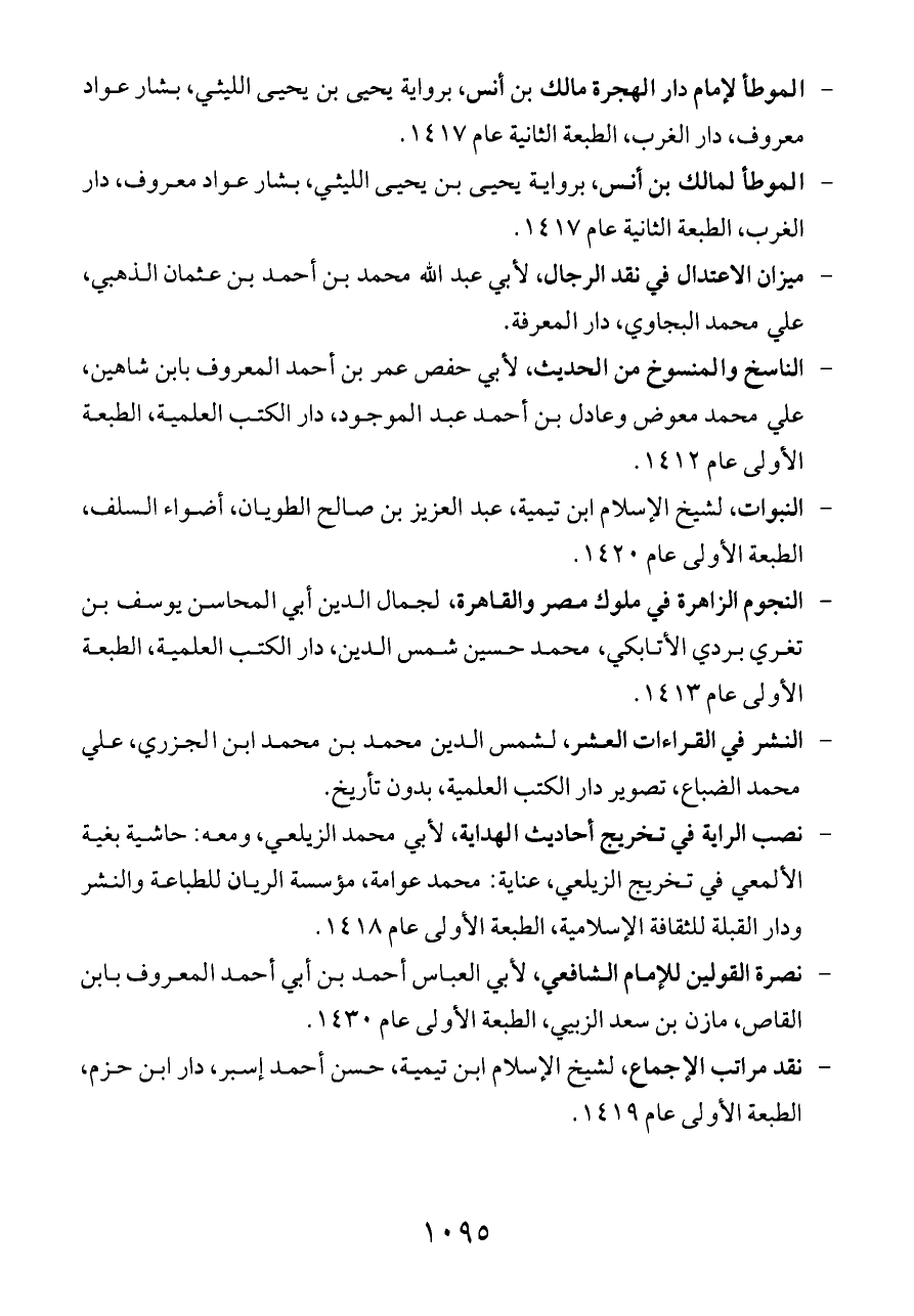 - الموطأ لمالك بن أنس، برواية يحيى بن يحيى الليثي، بشار عواد معروف، دار الغرب، الطبعة الثانية عام ١٤١٧.