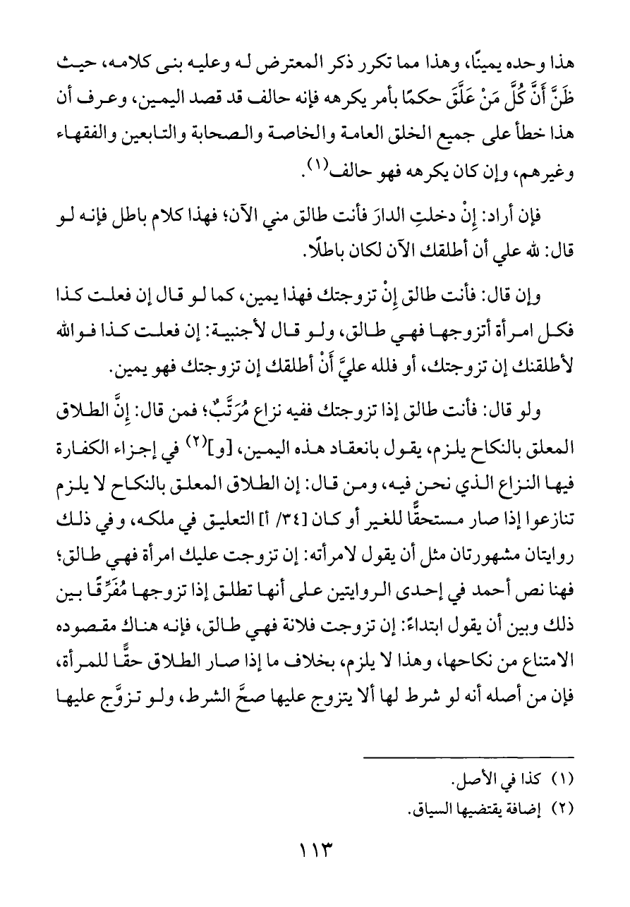 ولو قال: فأنت طالق إذا تزوجتك ففيه نزاع مُرَتَّبٌ؛ فمن قال: إِنَّ الطلاق المعلق بالنكاح يلزم، يقول بانعقاد هذه اليمين، [و] (¬٢) في إجزاء الكفارة فيها النزاع الذي نحن فيه، ومن قال: إن الطلاق المعلق بالنكاح لا يلزم تنازعوا إذا صار مستحقًّا للغير أو كان [٣٤/ أ] التعليق في ملكه، وفي ذلك روايتان مشهورتان مثل أن يقول لامرأته: إن تزوجت عليك امرأة فهي طالق؛ فهنا نص أحمد في إحدى الروايتين على أنها تطلق إذا تزوجها مُفَرِّقًا بين ذلك وبين أن يقول ابتداءً: إن تزوجت فلانة فهي طالق، فإنه هناك مقصوده الامتناع من نكاحها، وهذا لا يلزم، بخلاف ما إذا صار الطلاق حقًّا للمرأة، فإن من أصله أنه لو شرط لها ألا يتزوج عليها صحَّ الشرط، ولو تزوَّج عليها