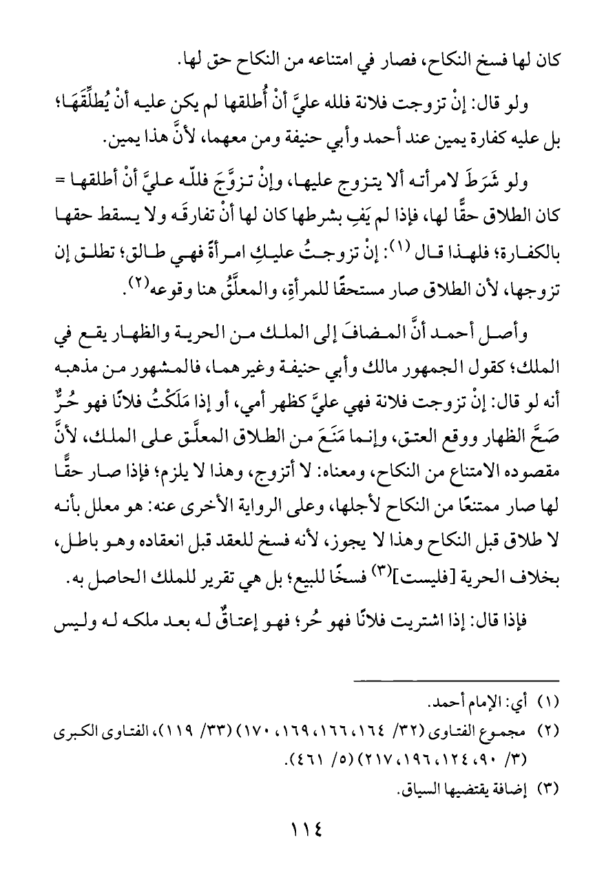 وأصل أحمد أنَّ المضافَ إلى الملك من الحرية والظهار يقع في الملك؛ كقول الجمهور مالك وأبي حنيفة وغيرهما، فالمشهور من مذهبه أنه لو قال: إنْ تزوجت فلانة فهي عليَّ كظهر أمي، أو إذا مَلَكْتُ فلانًا فهو حُرٌّ صَحَّ الظهار ووقع العتق، وإنما مَنَعَ من الطلاق المعلَّق على الملك، لأنَّ مقصوده الامتناع من النكاح، ومعناه: لا أتزوج، وهذا لا يلزم؛ فإذا صار حقًّا لها صار ممتنعًا من النكاح لأجلها، وعلى الرواية الأخرى عنه: هو معلل بأنه لا طلاق قبل النكاح وهذا لا يجوز، لأنه فسخ للعقد قبل انعقاده وهو باطل، بخلاف الحرية [فليست] (¬٣) فسخًا للبيع؛ بل هي تقرير للملك الحاصل به.