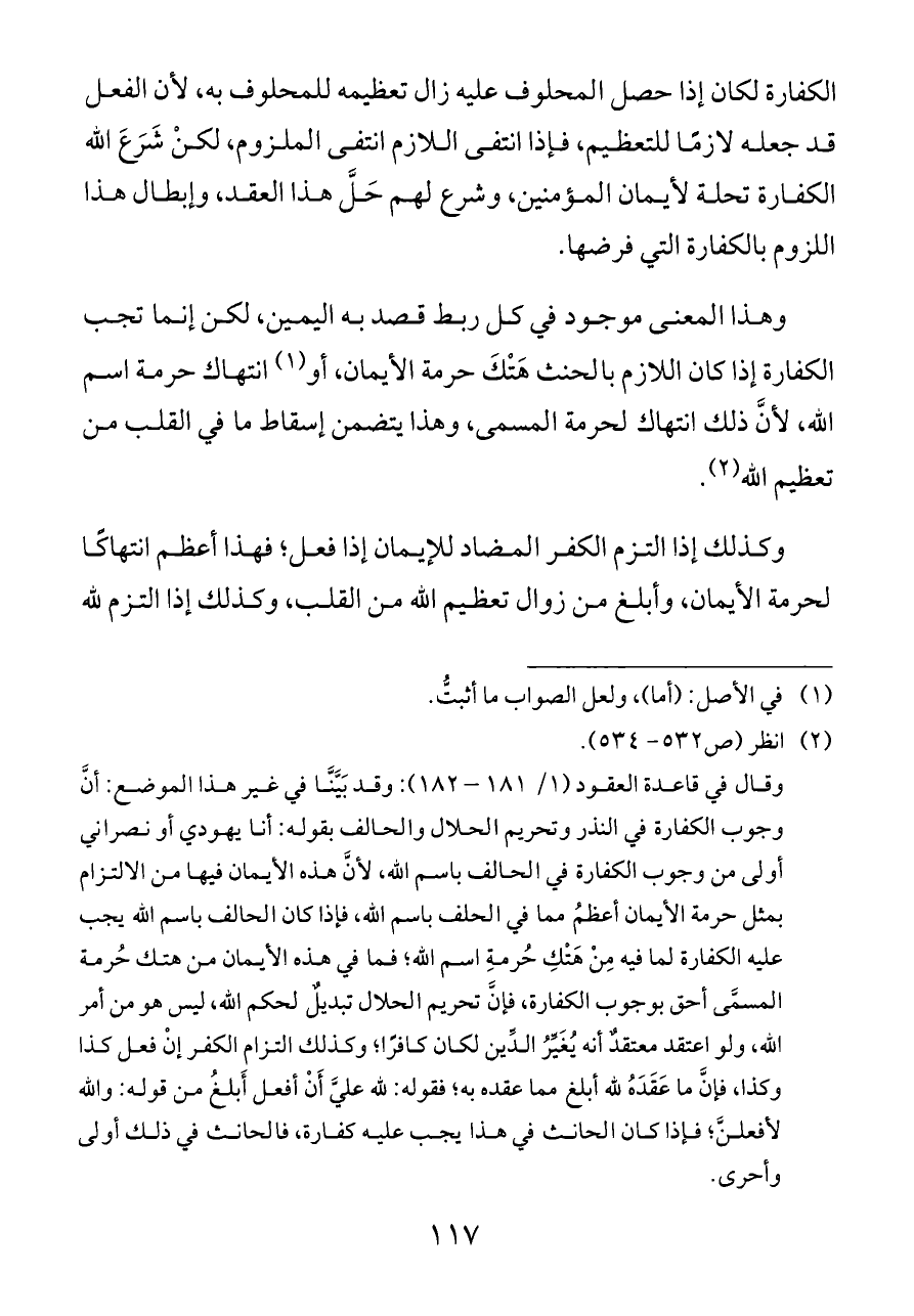 وقال في قاعدة العقود (١/ ١٨١ - ١٨٢): وقد بَيَّنَّا في غير هذا الموضع: أنَّ وجوب الكفارة في النذر وتحريم الحلال والحالف بقوله: أنا يهودي أو نصراني أولى من وجوب الكفارة في الحالف باسم الله، لأنَّ هذه الأيمان فيها من الالتزام بمثل حرمة الأيمان أعظمُ مما في الحلف باسم الله، فإذا كان الحالف باسم الله يجب عليه الكفارة لما فيه مِنْ هَتْكِ حُرمةِ اسم الله؛ فما في هذه الأيمان من هتك حُرمة المسمَّى أحق بوجوب الكفارة، فإنَّ تحريم الحلال تبديلٌ لحكم الله، ليس هو من أمر الله، ولو اعتقد معتقدٌ أنه يُغَيِّرُ الدِّين لكان كافرًا؛ وكذلك التزام الكفر إنْ فعل كذا وكذا، فإنَّ ما عَقَدَهُ لله أبلغ مما عقده به؛ فقوله: لله عليَّ أَنْ أفعل أَبلغُ من قوله: والله لأفعلنَّ؛ فإذا كان الحانث في هذا يجب عليه كفارة، فالحانث في ذلك أولى وأحرى.