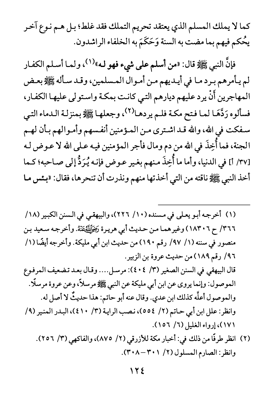 ولما أسلم الكفار لم يأمرهم برد ما في أيديهم من أموال المسلمين، وقد سأله - صلى الله عليه وسلم - بعض المهاجرين أَنْ يرد عليهم ديارهم التي كانت بمكة واستولى عليها الكفار، فسألوه رَدَّهَا لما فتح مكة فلم يردها (¬٢)، وجعلها - صلى الله عليه وسلم - بمنزلة الدماء التي سفكت في الله، والله قد اشترى من المؤمنين أنفسهم وأموالهم بأن لهم الجنة، فما أُخِذَ في الله من دم ومال فأجر المؤمنين فيه على الله لا عوض له [٣٧/ أ] في الدنيا، وأما ما أُخِذَ منهم بغير عوض فإنه يُرَدُّ إلى صاحبه؛ كما أخذ النبي - صلى الله عليه وسلم - ناقته من التي أخذتها منهم ونذرت أن تنحرها، فقال: «بئس ما