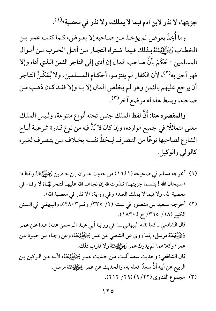 جزيتها، لا نذر لابن آدم فيما لا يملك، ولا نذر في معصية» (¬١).