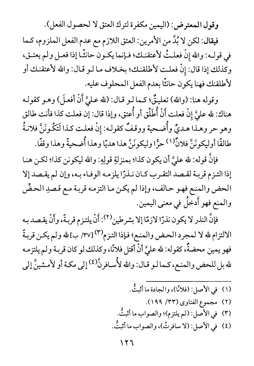 فيقال: لكن لا بُدَّ من الأمرين: العتق اللازم مع عدم الفعل الملزوم، كما في قوله: والله إِنْ فعلتُ لأعتقنك؛ فإنما يكون حانثًا إذا فعل ولم يعتق، وكذلك إذا قال: إِنْ فعلت لأطلقنك؛ بخلاف ما لو قال: والله لأعتقنك أو لأطلقنك فهنا يكون حانثًا بعدم الفعل المحلوف عليه.
