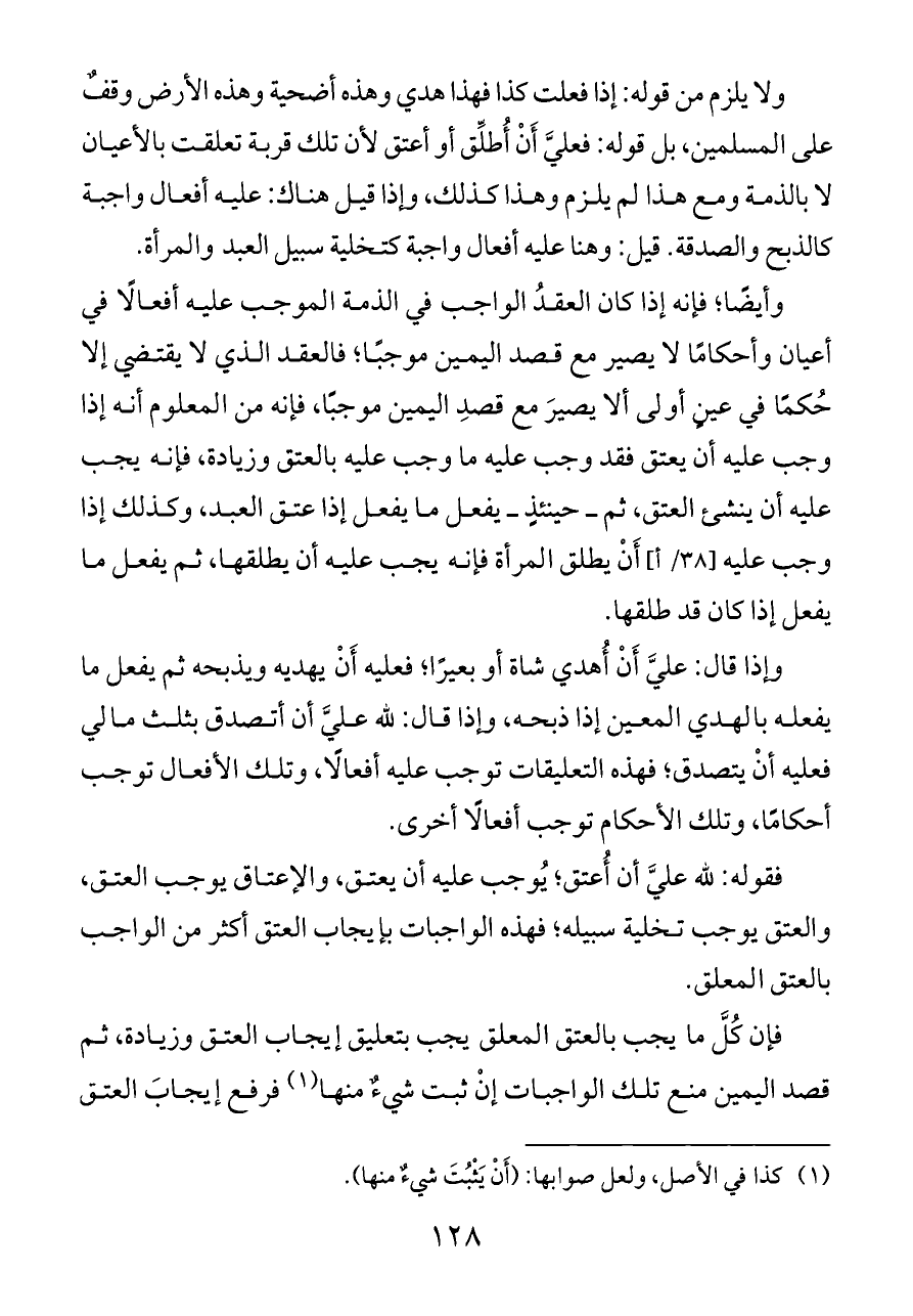 ولا يلزم من قوله: إذا فعلت كذا فهذا هدي وهذه أضحية وهذه الأرض وقفٌ على المسلمين، بل قوله: فعليَّ أَنْ أُطلِّق أو أعتق لأن تلك قربة تعلقت بالأعيان لا بالذمة ومع هذا لم يلزم وهذا كذلك، وإذا قيل هناك: عليه أفعال واجبة كالذبح والصدقة. قيل: وهنا عليه أفعال واجبة كتخلية سبيل العبد والمرأة.