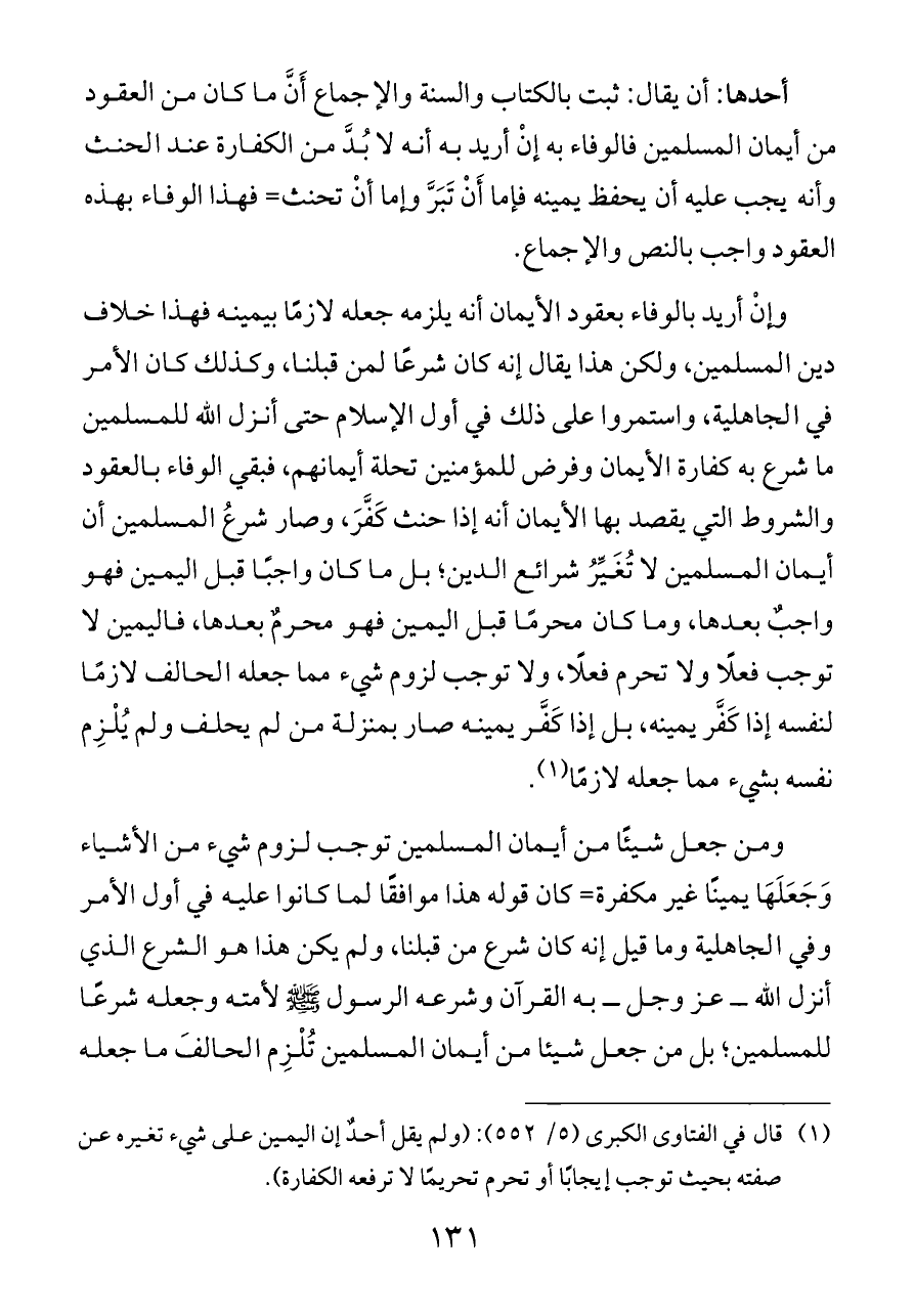 (¬١) قال في الفتاوى الكبرى (٥/ ٥٥٢): (ولم يقل أحدٌ إن اليمين على شيء تغيره عن صفته بحيث توجب إيجابًا أو تحرم تحريمًا لا ترفعه الكفارة).