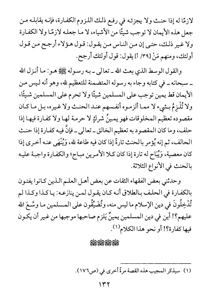 وحدثني بعض الفقهاء الثقات عن بعض أهل العلم الذين كانوا يفتون بالكفارة في الحلف بالطلاق أنه كان يقول لمن ينازعه: يا كذا وكذا لم تُدْخِلُونَ في دين الإسلام ما ليس منه، وتُضَيِّقُون على المسلمين ما وسَّعَ الله عليهم؟! أين في دين المسلمين يمينٌ يَلزم صاحبها موجبها من غير أن يكون فيها كفارة؟! أو نحو هذا الكلام (¬١).