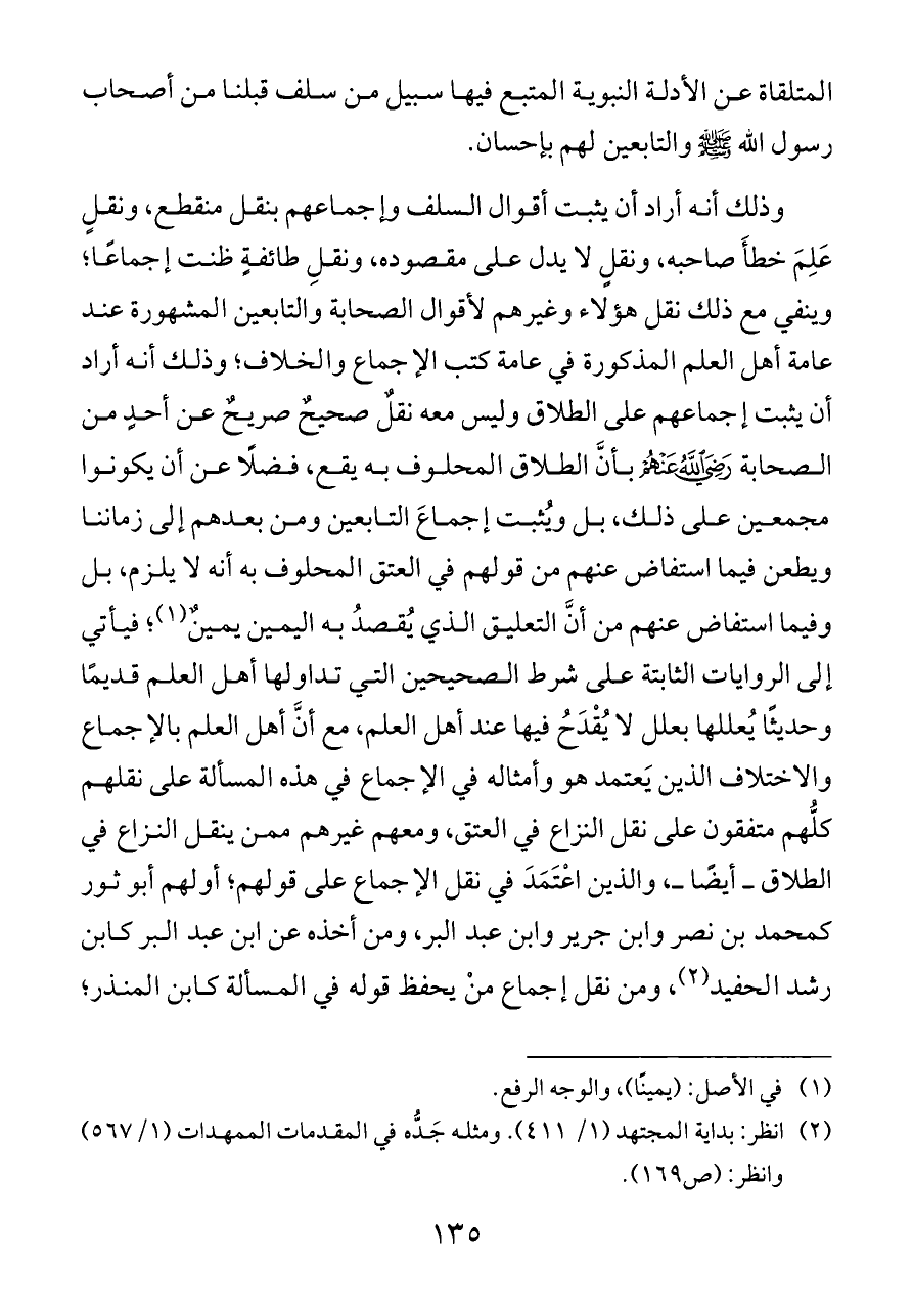 وذلك أنه أراد أن يثبت أقوال السلف وإجماعهم بنقل منقطع، ونقلٍ عَلِمَ خطأَ صاحبه، ونقلٍ لا يدل على مقصوده، ونقلِ طائفةٍ ظنت إجماعًا؛ وينفي مع ذلك نقل هؤلاء وغيرهم لأقوال الصحابة والتابعين المشهورة عند عامة أهل العلم المذكورة في عامة كتب الإجماع والخلاف؛ وذلك أنه أراد أن يثبت إجماعهم على الطلاق وليس معه نقلٌ صحيحٌ صريحٌ عن أحدٍ من الصحابة - رضي الله عنهم - بأنَّ الطلاق المحلوف به يقع، فضلًا عن أن يكونوا مجمعين على ذلك، بل ويُثبت إجماعَ التابعين ومن بعدهم إلى زماننا ويطعن فيما استفاض عنهم من قولهم في العتق المحلوف به أنه لا يلزم، بل وفيما استفاض عنهم من أنَّ التعليق الذي يُقصدُ به اليمين يمينٌ (¬١)؛ فيأتي إلى الروايات الثابتة على شرط الصحيحين التي تداولها أهل العلم قديمًا وحديثًا يُعللها بعلل لا يُقْدَحُ فيها عند أهل العلم، مع أنَّ أهل العلم بالإجماع والاختلاف الذين يَعتمد هو وأمثاله في الإجماع في هذه المسألة على نقلهم كلُّهم متفقون على نقل النزاع في العتق، ومعهم غيرهم ممن ينقل النزاع في الطلاق ــ أيضًا ــ، والذين اعْتَمَدَ في نقل الإجماع على قولهم؛ أولهم أبو ثور كمحمد بن نصر وابن جرير وابن عبد البر، ومن أخذه عن ابن عبد البر كابن رشد الحفيد (¬٢)، ومن نقل إجماع منْ يحفظ قوله في المسألة كابن المنذر؛