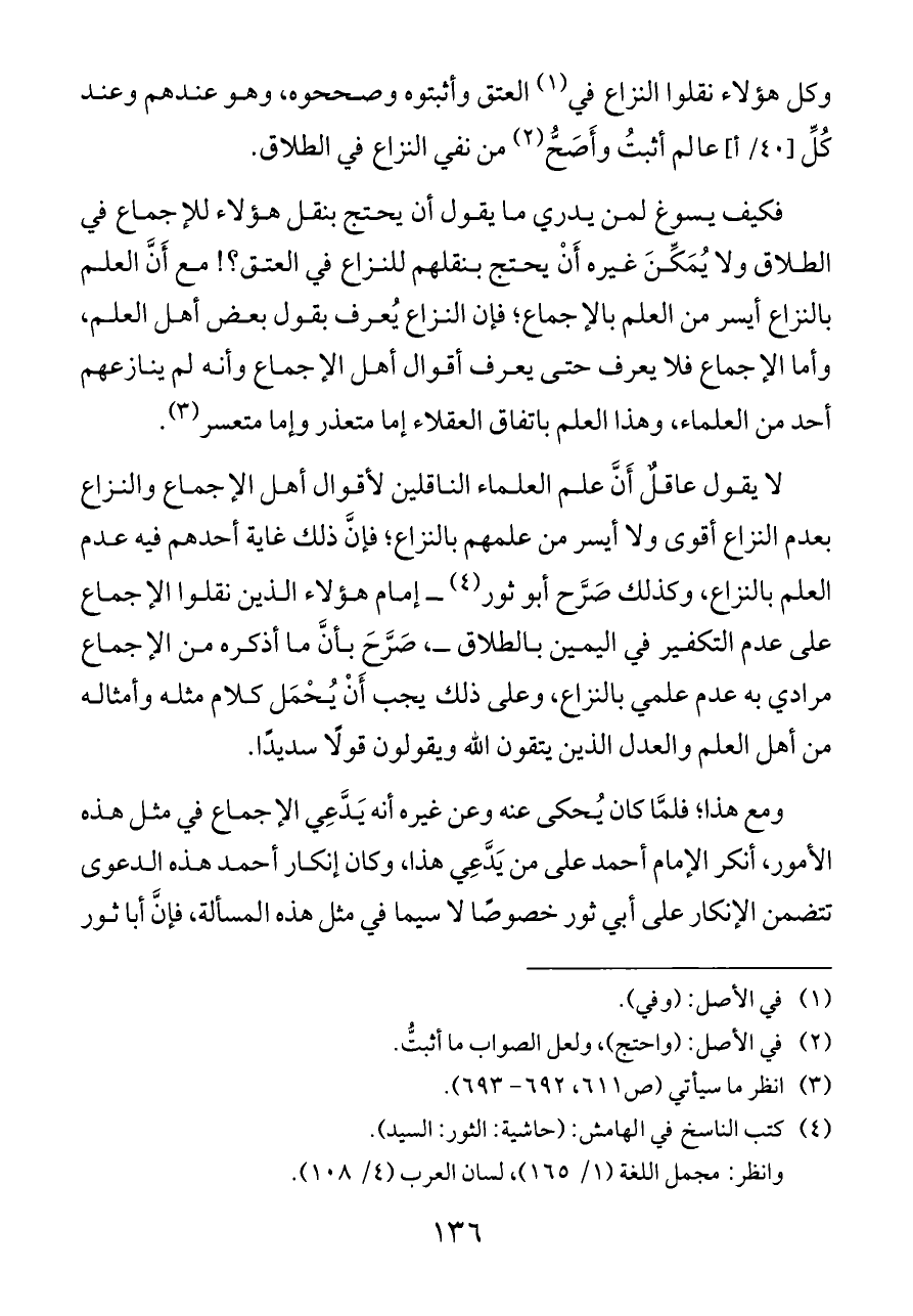 لا يقول عاقلٌ أَنَّ علم العلماء الناقلين لأقوال أهل الإجماع والنزاع بعدم النزاع أقوى ولا أيسر من علمهم بالنزاع؛ فإنَّ ذلك غاية أحدهم فيه عدم العلم بالنزاع، وكذلك صَرَّح أبو ثور (¬٤) ــ إمام هؤلاء الذين نقلوا الإجماع على عدم التكفير في اليمين بالطلاق ــ، صَرَّحَ بأنَّ ما أذكره من الإجماع مرادي به عدم علمي بالنزاع، وعلى ذلك يجب أَنْ يُحْمَل كلام مثله وأمثاله من أهل العلم والعدل الذين يتقون الله ويقولون قولًا سديدًا.