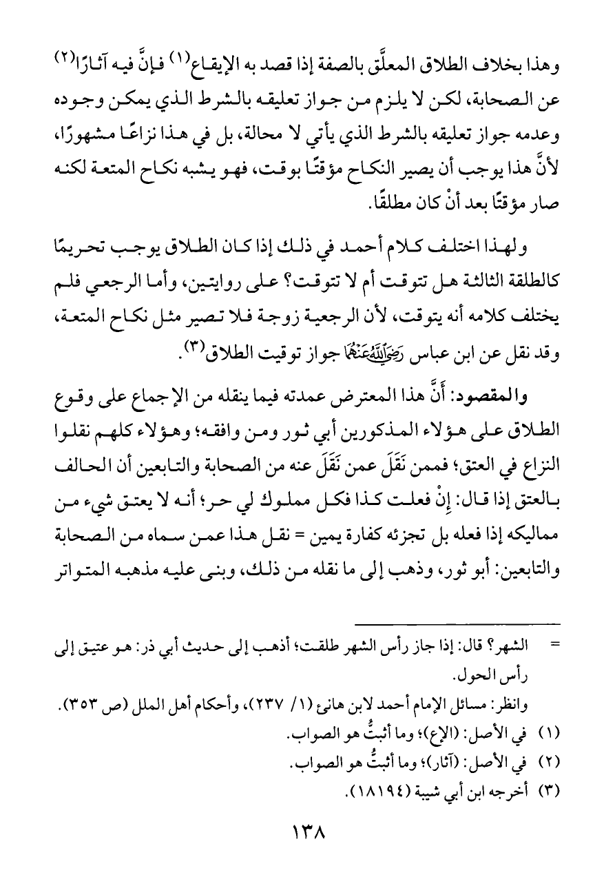 ولهذا اختلف كلام أحمد في ذلك إذا كان الطلاق يوجب تحريمًا كالطلقة الثالثة هل تتوقت أم لا تتوقت؟ على روايتين، وأما الرجعي فلم يختلف كلامه أنه يتوقت، لأن الرجعية زوجة فلا تصير مثل نكاح المتعة، وقد نقل عن ابن عباس - رضي الله عنهما - جواز توقيت الطلاق (¬٣).