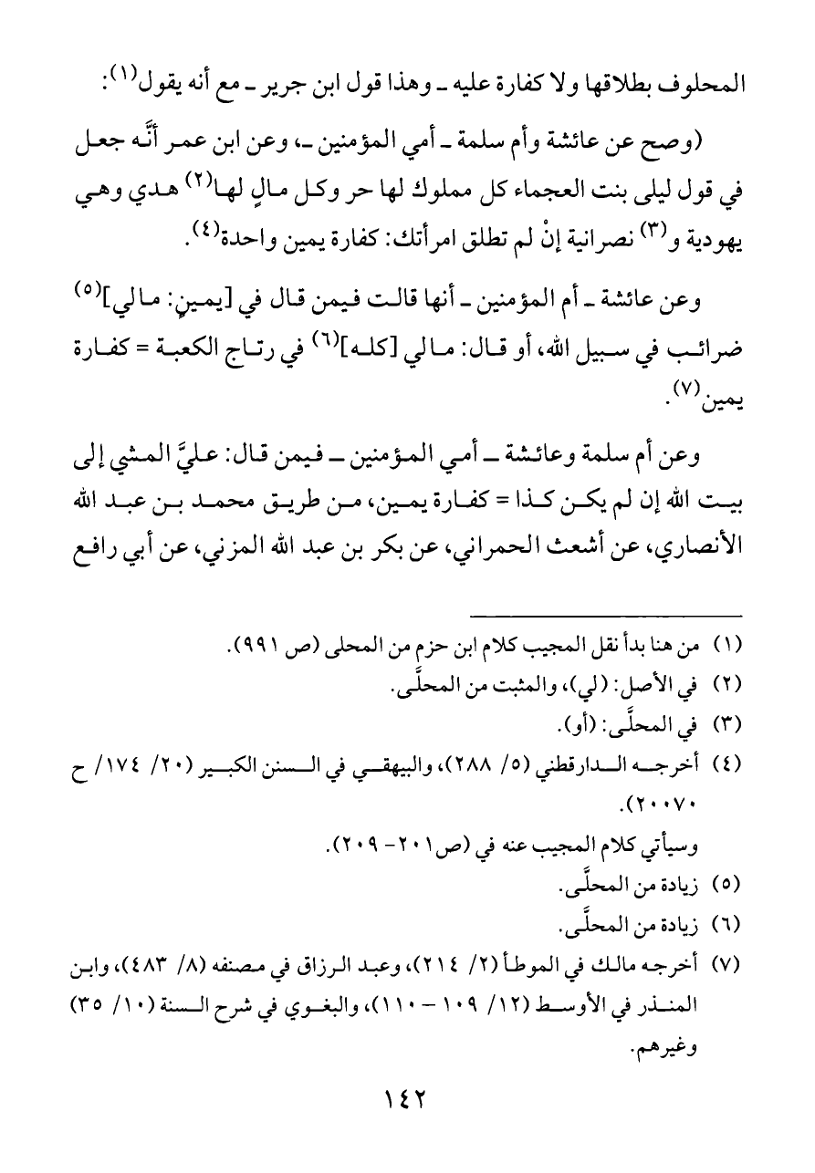 (وصح عن عائشة وأم سلمة ــ أمي المؤمنين ــ، وعن ابن عمر أنَّه جعل في قول ليلى بنت العجماء كل مملوك لها حر وكل مالٍ لها (¬٢) هدي وهي يهودية و (¬٣) نصرانية إنْ لم تطلق امرأتك: كفارة يمين واحدة (¬٤).