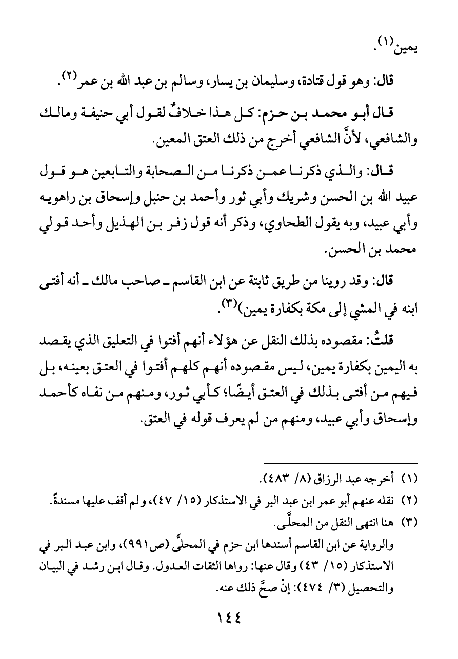قلتُ: مقصوده بذلك النقل عن هؤلاء أنهم أفتوا في التعليق الذي يقصد به اليمين بكفارة يمين، ليس مقصوده أنهم كلهم أفتوا في العتق بعينه، بل فيهم من أفتى بذلك في العتق أيضًا؛ كأبي ثور، ومنهم من نفاه كأحمد وإسحاق وأبي عبيد، ومنهم من لم يعرف قوله في العتق.