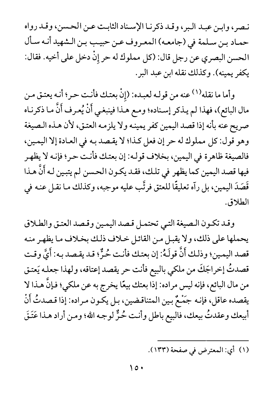 نصر، وابن عبد البر، وقد ذكرنا الإسناد الثابت عن الحسن، وقد رواه حماد بن سلمة في (جامعه) المعروف عن حبيب بن الشهيد أنه سأل الحسن البصري عن رجل قال: (كل مملوك له حر إِنْ دخل على أخيه. فقال: يكفر يمينه). وكذلك نقله ابن عبد البر.