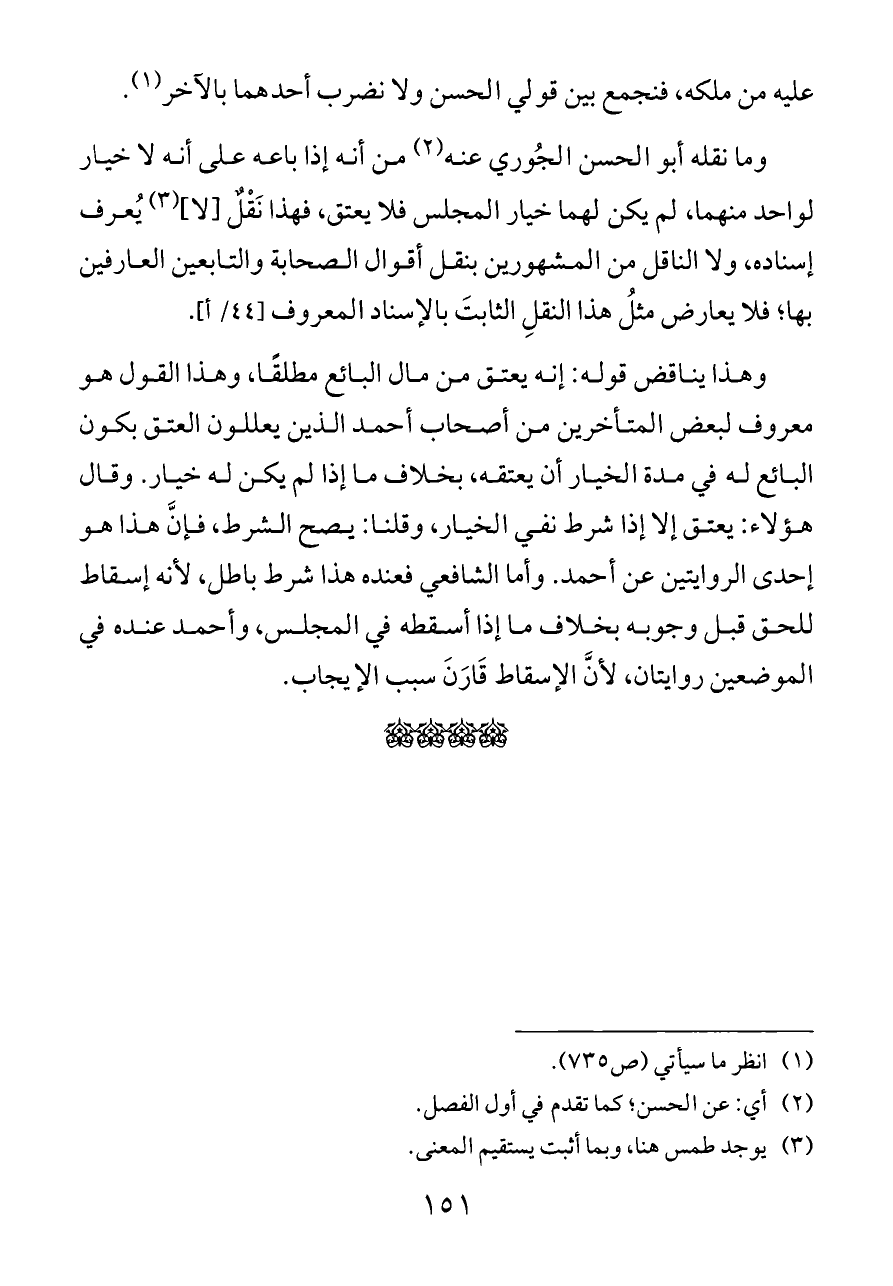 وما نقله أبو الحسن الجُوري عنه (¬٢) من أنه إذا باعه على أنه لا خيار لواحد منهما، لم يكن لهما خيار المجلس فلا يعتق، فهذا نَقْلٌ [لا] (¬٣) يُعرف إسناده، ولا الناقل من المشهورين بنقل أقوال الصحابة والتابعين العارفين بها؛ فلا يعارض مثلُ هذا النقلِ الثابتَ بالإسناد المعروف [٤٤/ أ].