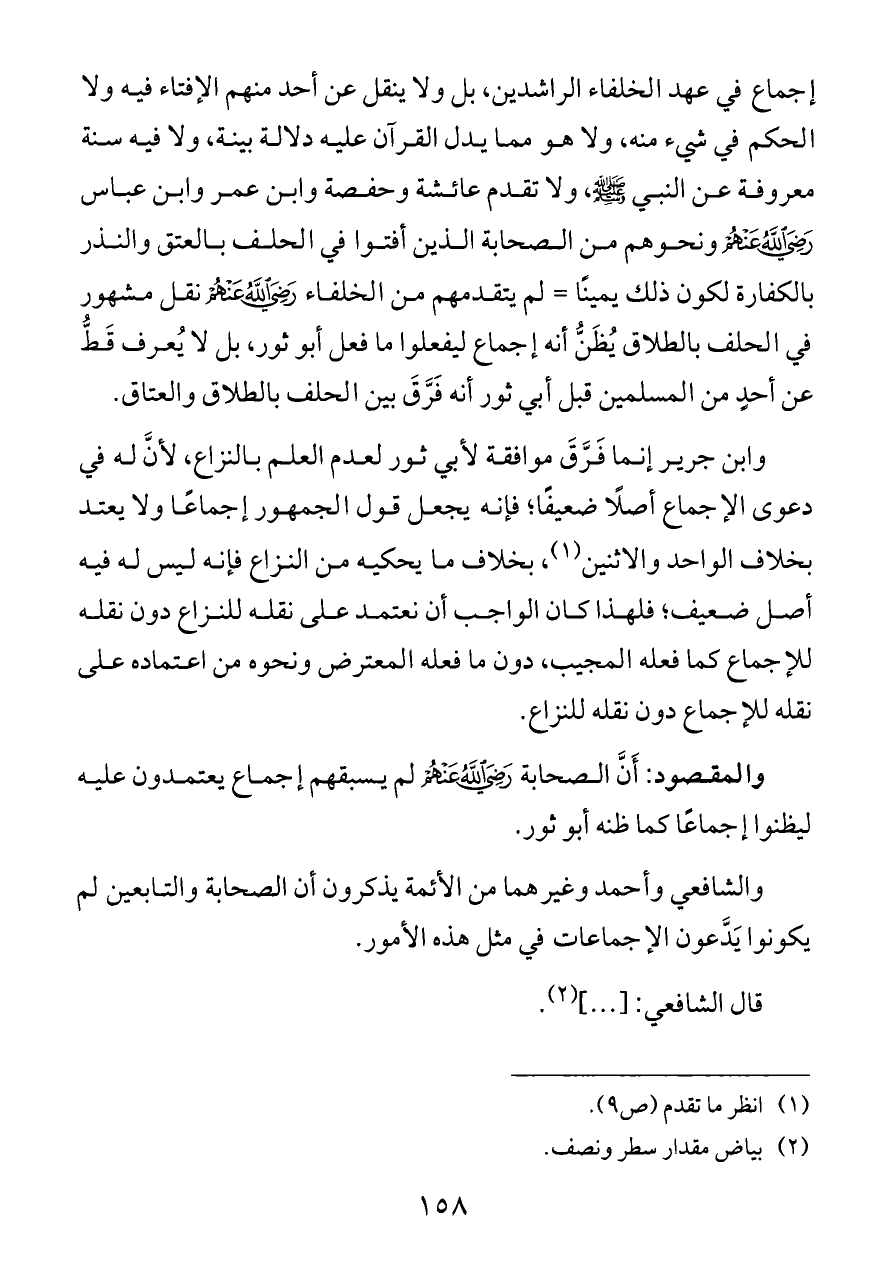 إجماع في عهد الخلفاء الراشدين، بل ولا ينقل عن أحد منهم الإفتاء فيه ولا الحكم في شيء منه، ولا هو مما يدل القرآن عليه دلالة بينة، ولا فيه سنة معروفة عن النبي - صلى الله عليه وسلم -، ولا تقدم عائشة وحفصة وابن عمر وابن عباس - رضي الله عنهم - ونحوهم من الصحابة الذين أفتوا في الحلف بالعتق والنذر بالكفارة لكون ذلك يمينًا = لم يتقدمهم من الخلفاء - رضي الله عنهم - نقل مشهور في الحلف بالطلاق يُظَنُّ أنه إجماع ليفعلوا ما فعل أبو ثور، بل لا يُعرف قَطُّ عن أحدٍ من المسلمين قبل أبي ثور أنه فَرَّقَ بين الحلف بالطلاق والعتاق.