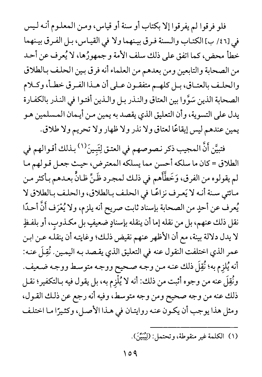 فلو فرقوا لم يفرقوا إلا بكتاب أو سنة أو قياس، ومن المعلوم أنه ليس في [٤٦/ ب] الكتاب والسنة فرق بينهما ولا في القياس، بل الفرق بينهما خطأ محض، كما اتفق على ذلك سلف الأمة وجمهورُها، لا يُعرف عن أحد من الصحابة والتابعين ومن بعدهم من العلماء أنه فرق بين الحلف بالطلاق والحلف بالعتاق، بل كلهم متفقون على أن هذا الفرق خطأ، وكلام الصحابة الذين سَوَّوا بين العتاق والنذر بل والذين أفتوا في النذر بالكفارة يدل على التسوية، وأن التعليق الذي يقصد به يمين من أيمان المسلمين هو يمين عندهم ليس إيقاعًا لعتاق ولا نذر ولا ظهار ولا تحريم ولا طلاق.