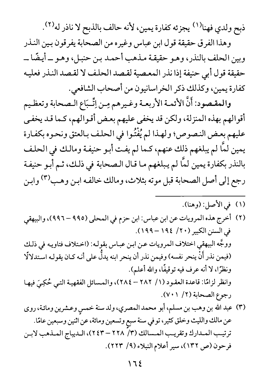 ووجَّه البيهقي اختلاف المرويات عن ابن عباس بقوله: (اختلاف فتاويه في ذلك (فيمن نذر أَنْ ينحر نفسه) وفيمن نذر أن ينحر ابنه يدلُّ على أنه كان يقوله استدلالًا ونظرًا، لا أنه عرف فيه توقيفًا، والله أعلم).
