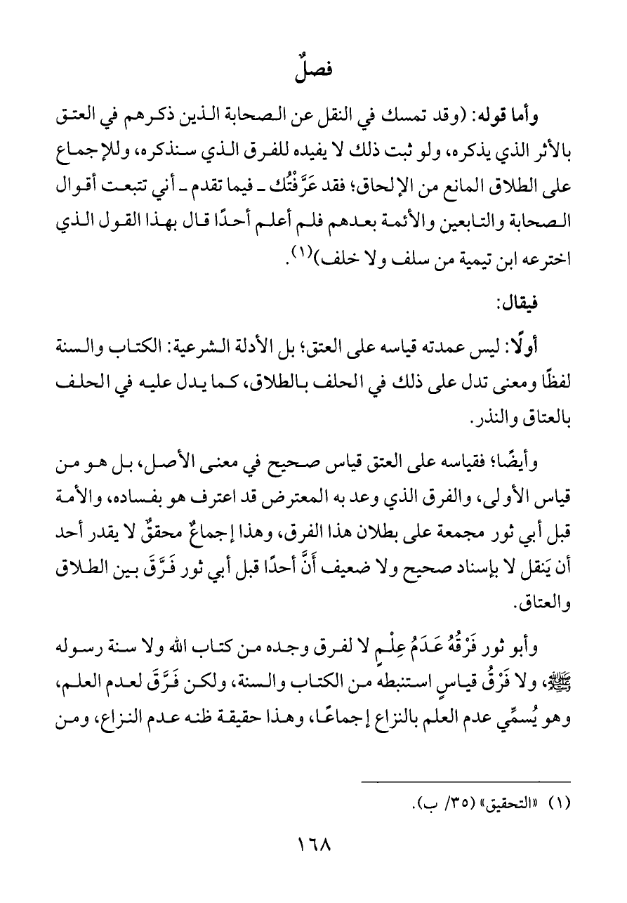 وأيضًا؛ فقياسه على العتق قياس صحيح في معنى الأصل، بل هو من قياس الأولى، والفرق الذي وعد به المعترض قد اعترف هو بفساده، والأمة قبل أبي ثور مجمعة على بطلان هذا الفرق، وهذا إجماعٌ محققٌ لا يقدر أحد أن يَنقل لا بإسناد صحيح ولا ضعيف أَنَّ أحدًا قبل أبي ثور فَرَّقَ بين الطلاق والعتاق.