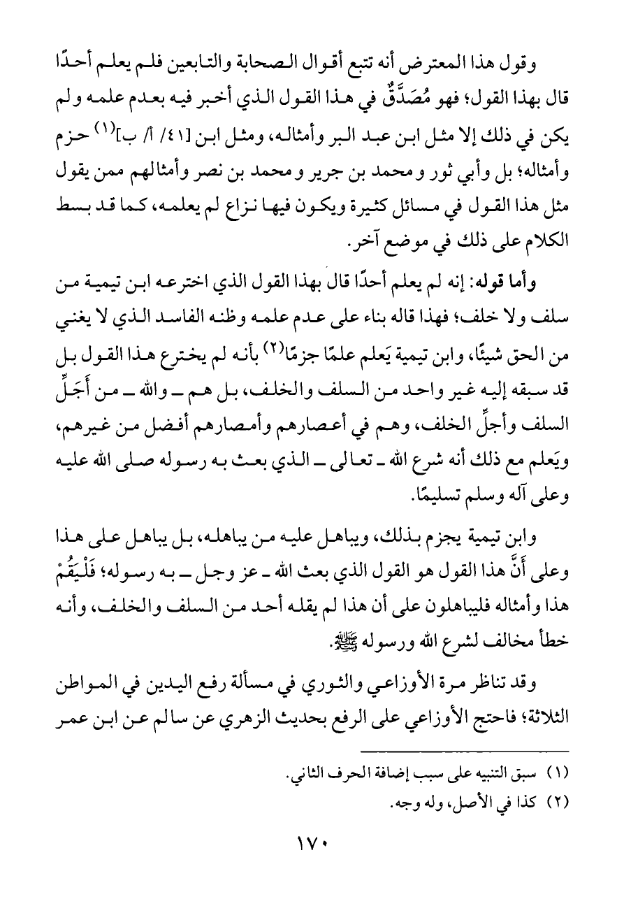 وقول هذا المعترض أنه تتبع أقوال الصحابة والتابعين فلم يعلم أحدًا قال بهذا القول؛ فهو مُصَدَّقٌ في هذا القول الذي أخبر فيه بعدم علمه ولم يكن في ذلك إلا مثل ابن عبد البر وأمثاله، ومثل ابن [٤١/ أ/ ب] (¬١) حزم وأمثاله؛ بل وأبي ثور ومحمد بن جرير ومحمد بن نصر وأمثالهم ممن يقول مثل هذا القول في مسائل كثيرة ويكون فيها نزاع لم يعلمه، كما قد بسط الكلام على ذلك في موضع آخر.