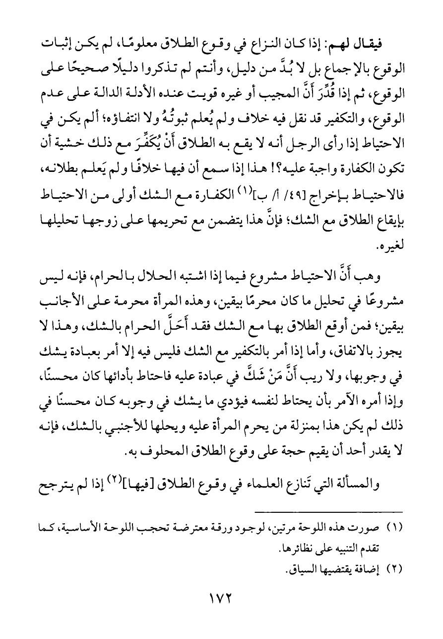 وهب أَنَّ الاحتياط مشروع فيما إذا اشتبه الحلال بالحرام، فإنه ليس مشروعًا في تحليل ما كان محرمًا بيقين، وهذه المرأة محرمة على الأجانب بيقين؛ فمن أوقع الطلاق بها مع الشك فقد أَحَلَّ الحرام بالشك، وهذا لا يجوز بالاتفاق، وأما إذا أمر بالتكفير مع الشك فليس فيه إلا أمر بعبادة يشك في وجوبها، ولا ريب أَنَّ مَنْ شَكَّ في عبادة عليه فاحتاط بأدائها كان محسنًا، وإذا أمره الآمر بأن يحتاط لنفسه فيؤدي ما يشك في وجوبه كان محسنًا في ذلك لم يكن هذا بمنزلة من يحرم المرأة عليه ويحلها للأجنبي بالشك، فإنه لا يقدر أحد أن يقيم حجة على وقوع الطلاق المحلوف به.
