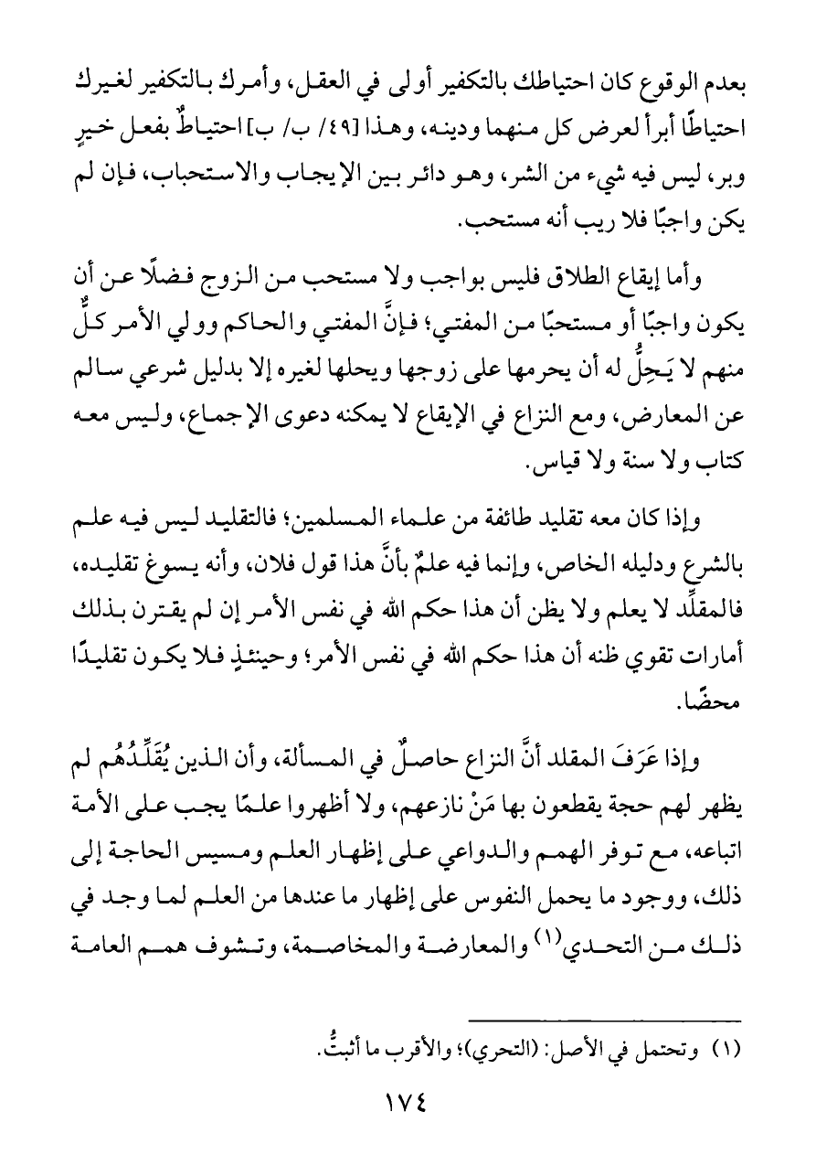 بعدم الوقوع كان احتياطك بالتكفير أولى في العقل، وأمرك بالتكفير لغيرك احتياطًا أبرأ لعرض كل منهما ودينه، وهذا [٤٩/ ب/ ب] احتياطٌ بفعل خيرٍ وبر، ليس فيه شيء من الشر، وهو دائر بين الإيجاب والاستحباب، فإن لم يكن واجبًا فلا ريب أنه مستحب.