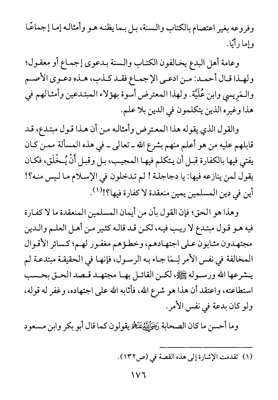 وهذا هو الحق؛ فإن القول بأن من أيمان المسلمين المنعقدة ما لا كفارة فيه هو قول مبتدع لا ريب فيه، لكن قد قاله كثير من أهل العلم والدين مجتهدون مثابون على اجتهادهم، وخطؤهم مغفور لهم؛ كسائر الأقوال المخالفة في نفس الأمر لِمَا جاء به الرسول، فإنها في الحقيقة مبتدعة لم يشرعها الله ورسوله - صلى الله عليه وسلم -، لكن القائل بها مجتهد قصد الحق بحسب استطاعته، واعتقد أن هذا هو شرع الله، فأثابه الله على اجتهاده، وغفر له قوله، ولو كان بدعة في نفس الأمر.