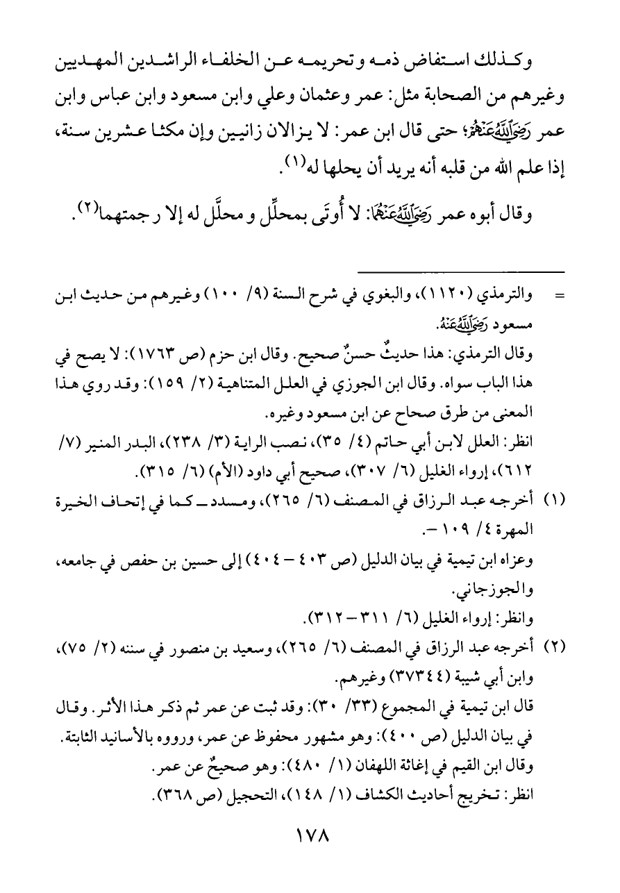 وكذلك استفاض ذمه وتحريمه عن الخلفاء الراشدين المهديين وغيرهم من الصحابة مثل: عمر وعثمان وعلي وابن مسعود وابن عباس وابن عمر - رضي الله عنهم -؛ حتى قال ابن عمر: لا يزالان زانيين وإن مكثا عشرين سنة، إذا علم الله من قلبه أنه يريد أن يحلها له (¬١).