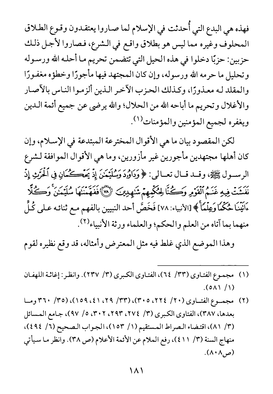 لكن المقصود بيان ما هي الأقوال المخترعة المبتدعة في الإسلام، وإن كان أهلها مجتهدين مأجورين غير مأزورين، وما هي الأقوال الموافقة لشرع الرسول - صلى الله عليه وسلم -، وقد قال تعالى: {وَدَاوُودَ وَسُلَيْمَانَ إِذْ يَحْكُمَانِ فِي الْحَرْثِ إِذْ نَفَشَتْ فِيهِ غَنَمُ الْقَوْمِ وَكُنَّا لِحُكْمِهِمْ شَاهِدِينَ (٧٨) فَفَهَّمْنَاهَا سُلَيْمَانَ وَكُلًّا آتَيْنَا حُكْمًا وَعِلْمًا} [الأنبياء: ٧٨] فَخَصَّ أحد النبيين بالفهم مع ثنائه على كُلٍّ منهما بما آتاه من العلم والحكم؛ والعلماء ورثة الأنبياء (¬٢).